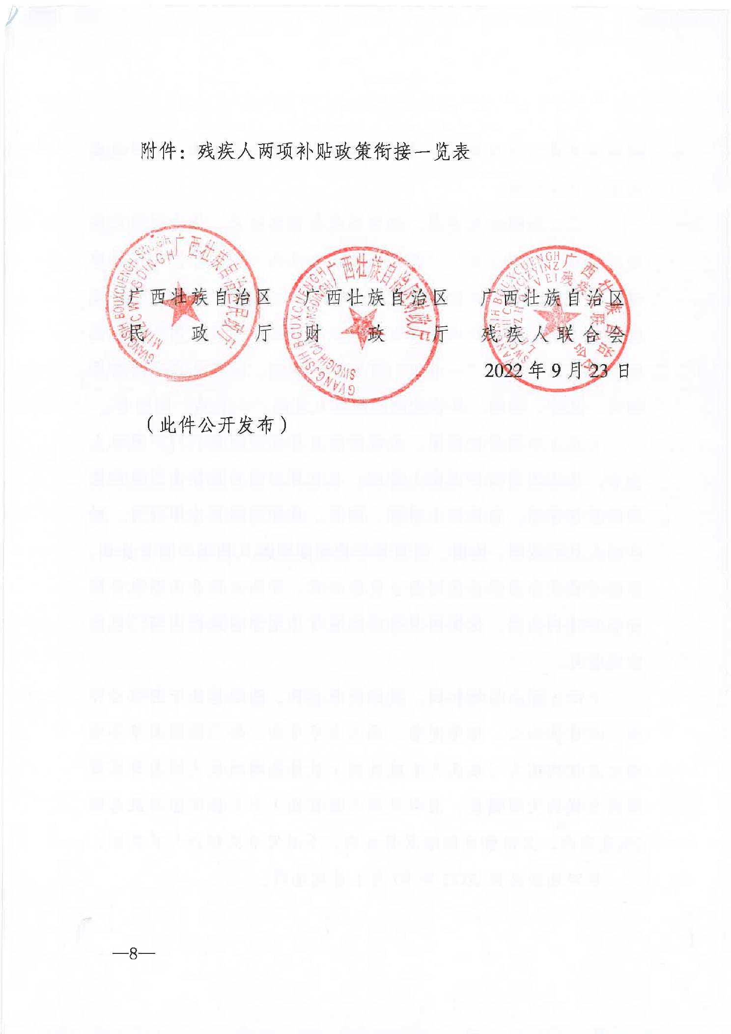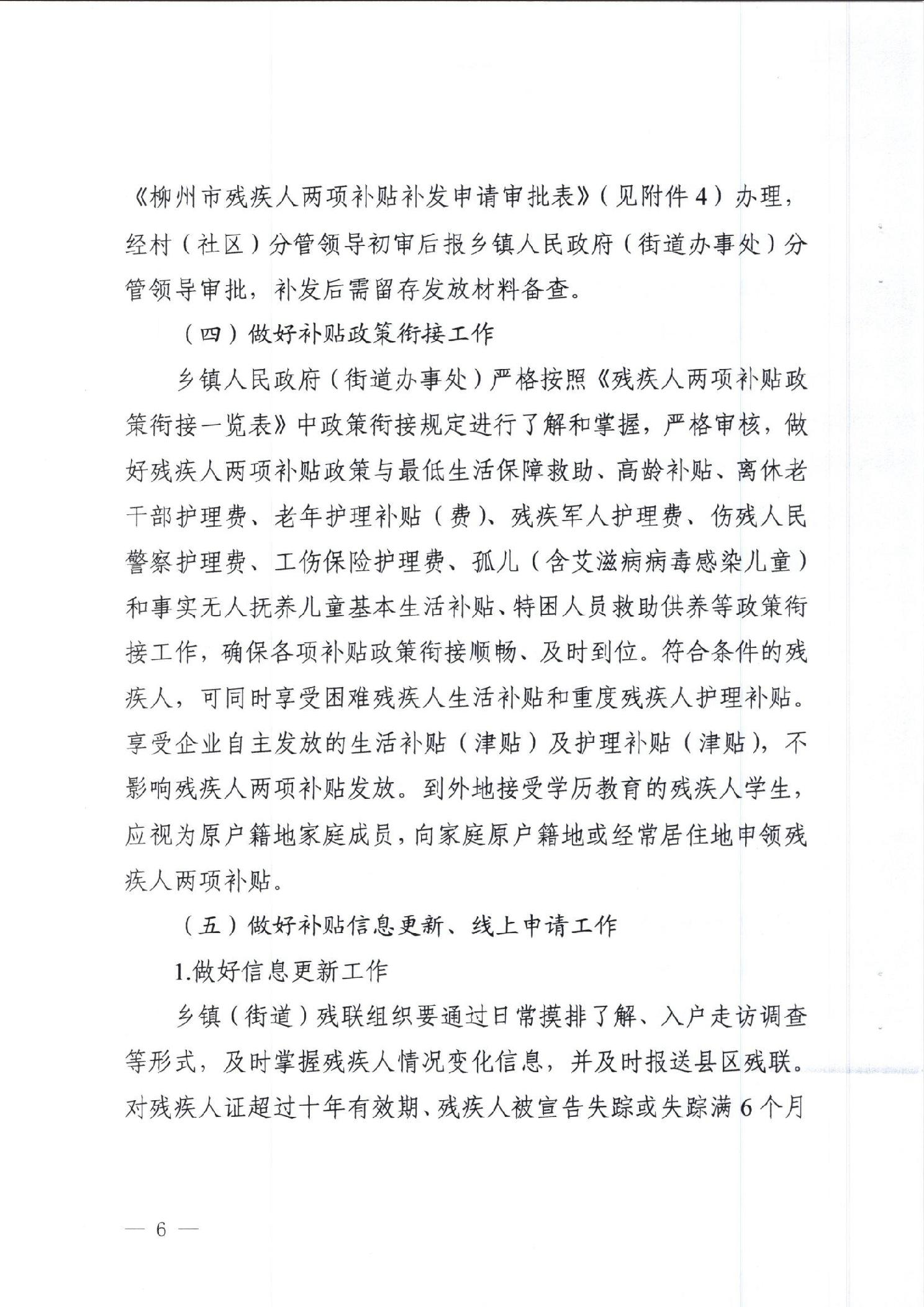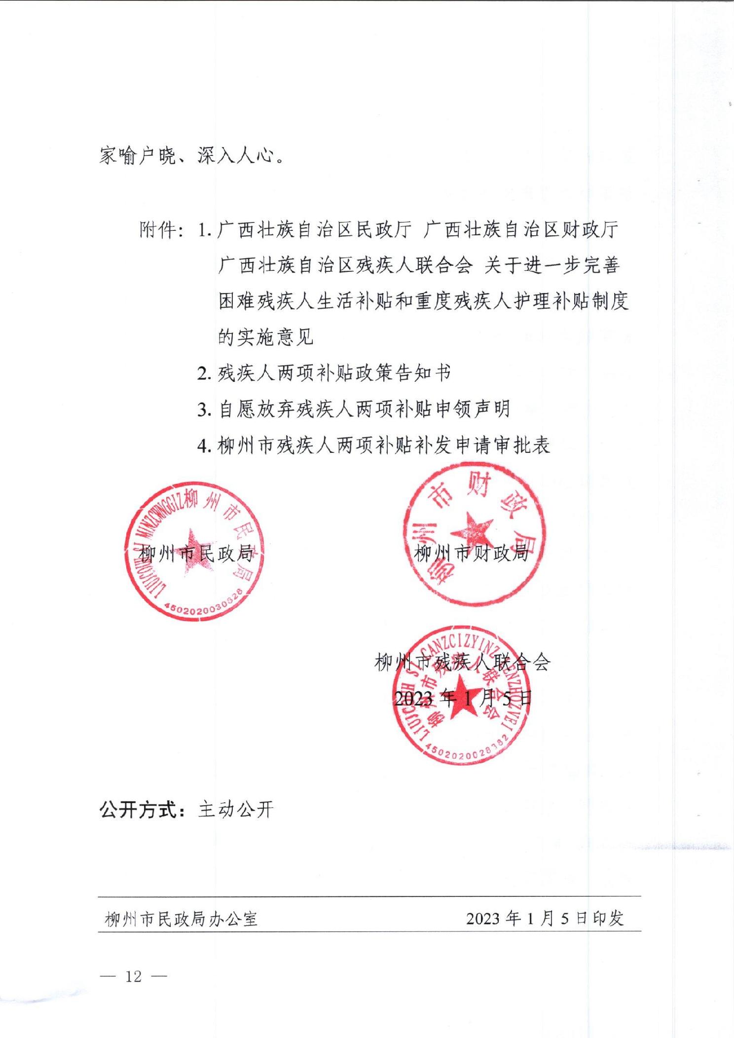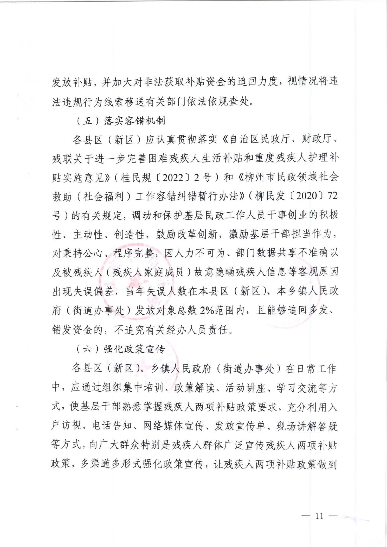 柳民发〔2023〕2号 柳州市民政局 柳州市财政局 柳州市残疾人联合会 关于进一步完善困难残疾人生活补贴和重度残疾人护理补贴制度的通知