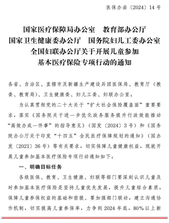 医保办函〔2024〕14号 国家医疗保障局办公室等部门关于开展儿童参加基本医疗保险专项行动的通知