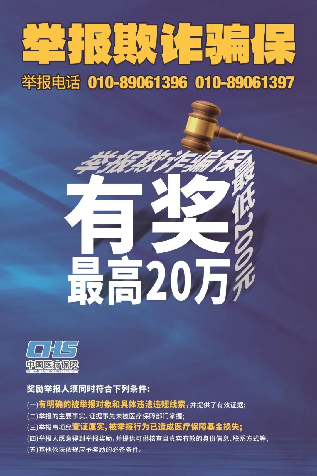 根据去年年末,国家医保局与财政部两部委联合发布的《违法违规使用医疗保障基金举报奖励办法》,按照案值的一定比例给予一次性资金奖励,最高不超过 20万元,最低不少于 200 元。这一规定将此前的最高奖励从10万元提高到了20万元。