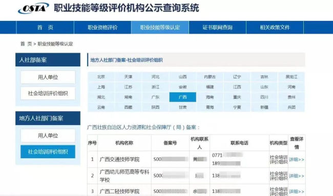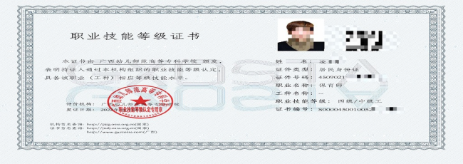 2. 职业技能等级证书:职业技能等级由经人社部门备案的职业技能等级认定机构组织实施并颁发证书,广西及全国可开展考核认定的机构及职业(工种),可在人社部技能人才评价工作网查询,网址:http://pjjg.osta.org.cn/。
