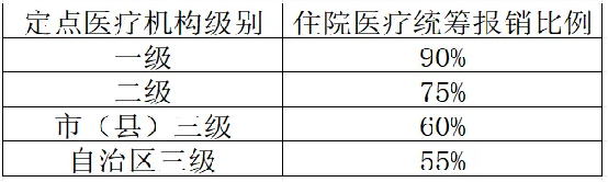 居民医保参保人员在一级、二级、市(县)三级、自治区三级定点医疗机构住院基金支付比例分别为90%,75%,60%,55%。