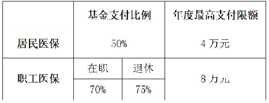 参保人员在定点医疗机构门诊发生的单列门诊统筹支付的医保药品费用,不设起付线,由医疗保险统筹基金和参保人员共同负担。其中居民医保的统筹基金支付比例为50%;职工医保的统筹基金支付比例为:在职人员70%、退休人员75%。设置年度最高支付限额,其中居民医保为4万元,职工医保为8万元,分别计入当地居民医保和职工医保年度最高支付限额。