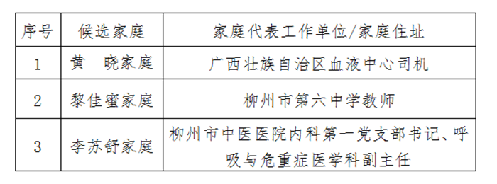 为深入学习宣传贯彻党的十九大精神和习近平总书记关于“注重家庭、注重家教、注重家风”的重要指示精神,根据市委文明办《关于开展第二届柳州市文明家庭推荐评选活动的通知》要求,鱼峰区广泛发动符合条件的家庭进行申报。经基层推荐和材料审核,并向候选家庭的家庭成员所在单位和社区以及区政法委、卫健局等相关部门广泛征求意见,现将第二届柳州市文明家庭拟推荐名单公示如下: