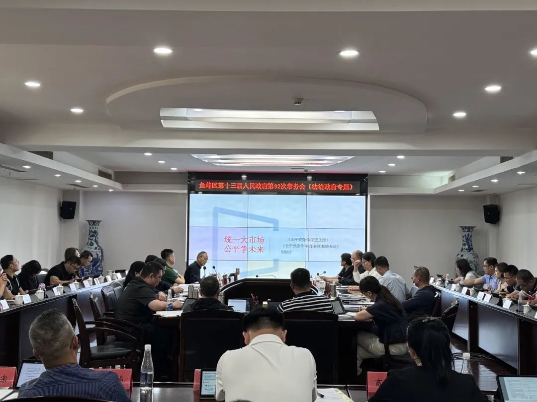 为深入贯彻党中央关于公平竞争审查制度的决策部署,提升全区领导干部的法治思维和深化改革能力,推动法治政府建设,5月26日,鱼峰区召开第十三届人民政府第92次常务会,区委副书记、区长彭继军主持会议。会议特别举办了主题为《统一大市场 公平争未来》的2025年第一期法治专题讲座。