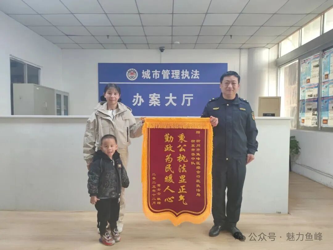 近日,鱼峰区综合行政执法局柳东市容中队办公室迎来一份特殊的“礼物”——流动早餐摊主黄女士送来一面印有“秉公执法显正气 勤政为民暖人心”的锦旗,以此表达对执法人员暖心执法与贴心帮助的诚挚感谢。