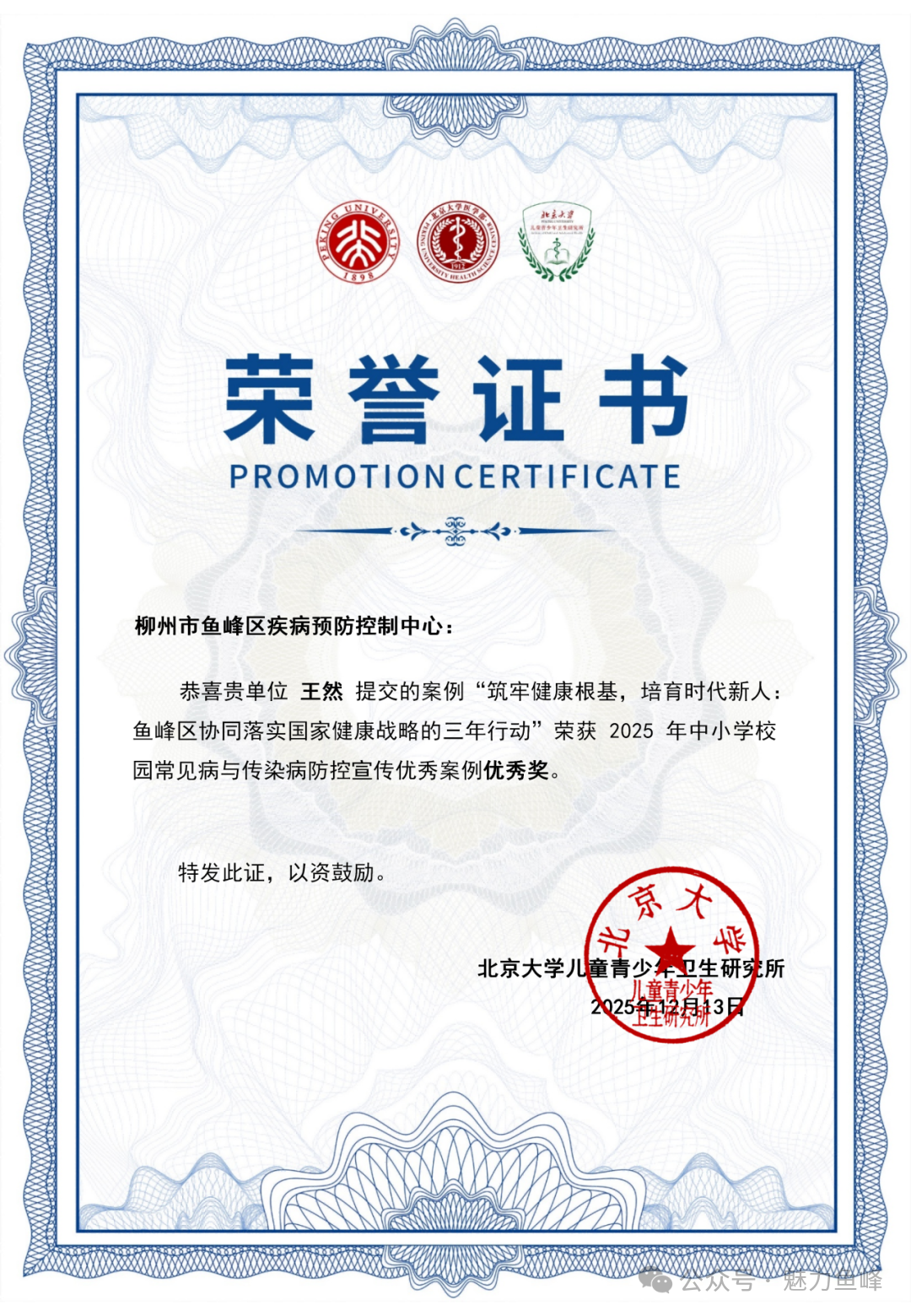 近日,鱼峰区疾病预防控制中心获得由北京大学儿童青少年卫生研究所颁发的“2025年中小学校园常见病与传染病防控宣传优秀案例”优秀奖。这一荣誉,不仅是对鱼峰区校园健康促进工作的高度认可,更是对三年来多方协同、扎实推动国家健康战略落地鱼峰的生动注脚。