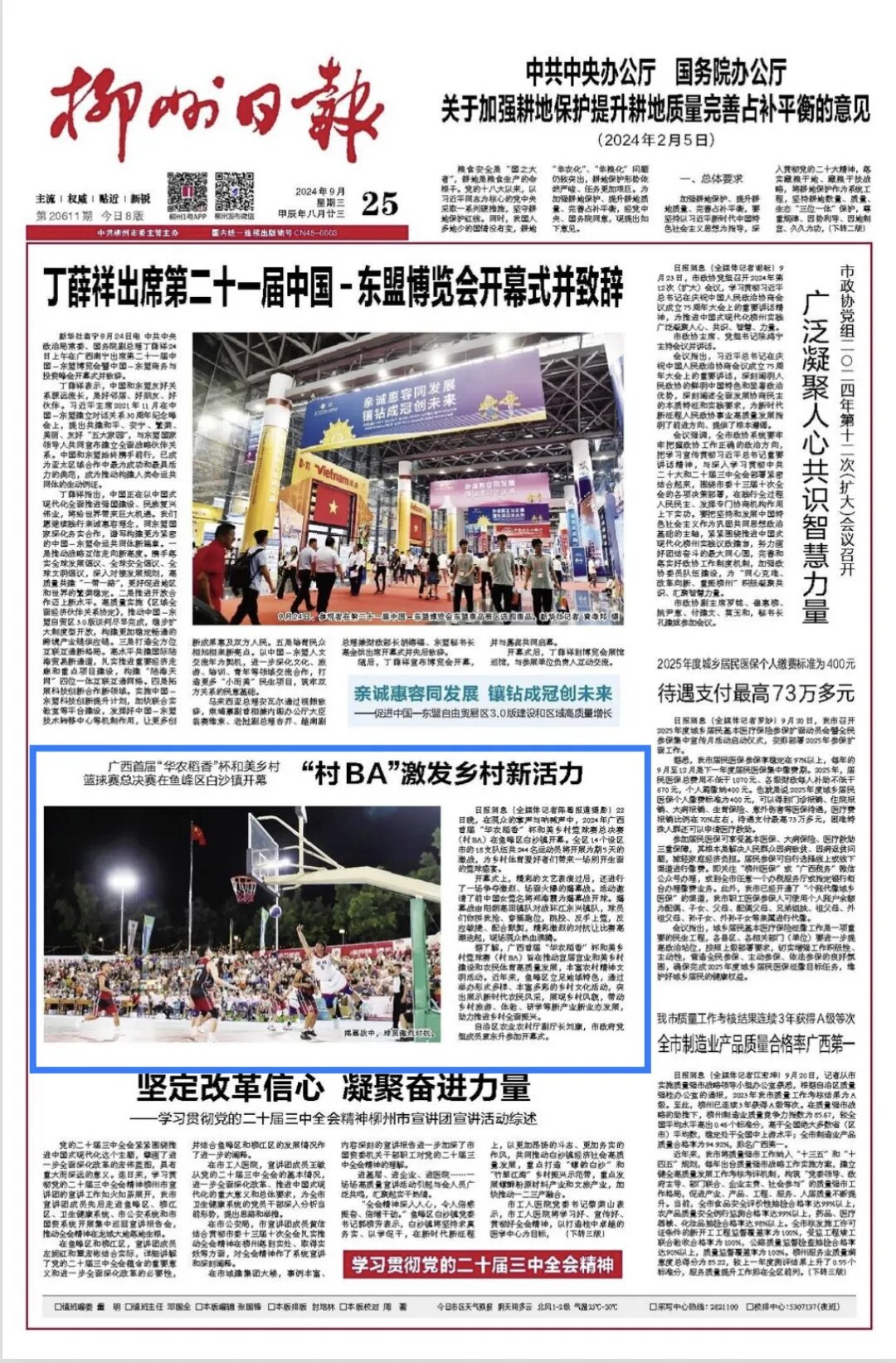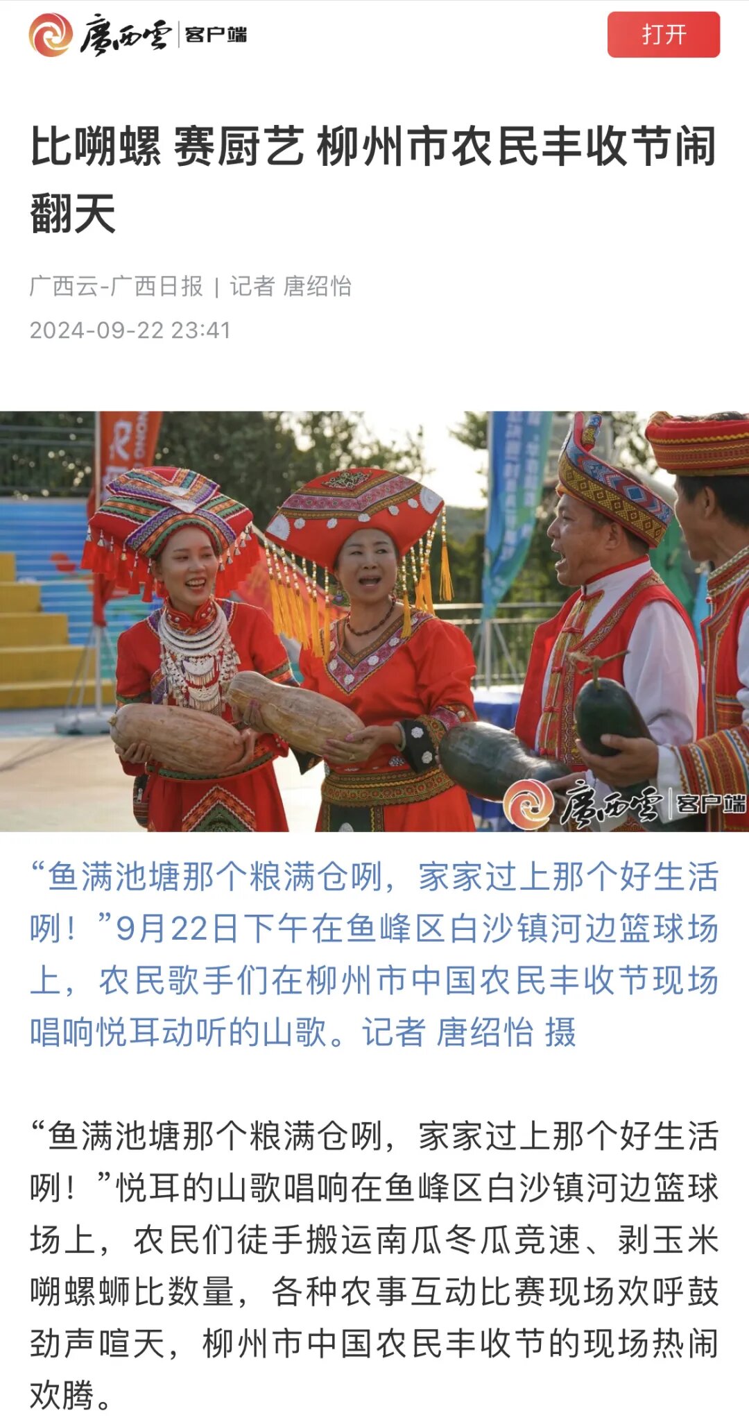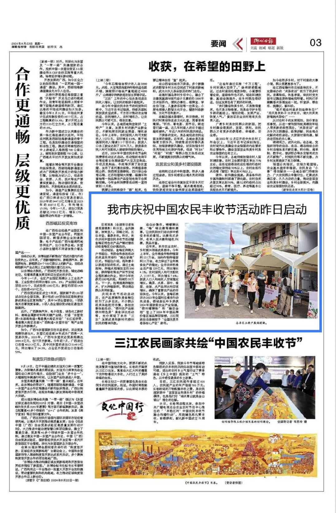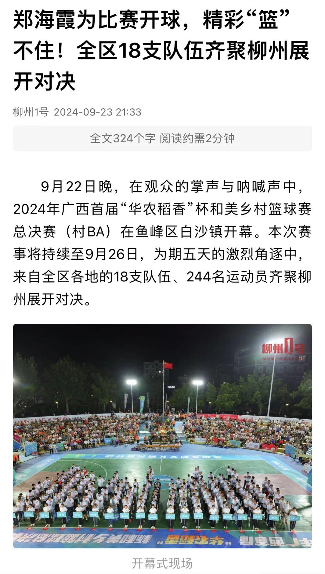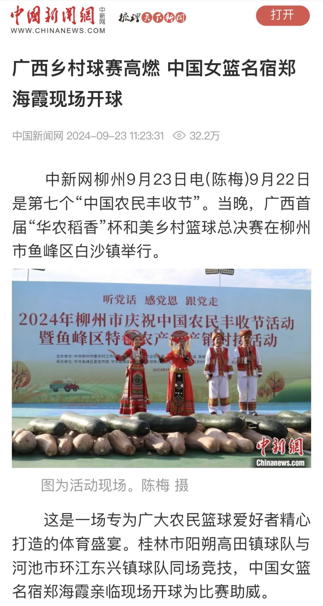 9月22日,2024年柳州市庆祝中国农民丰收节系列活动、2024年广西首届“华农稻香”杯和美乡村篮球赛总决赛(村BA)在美丽的柳州市鱼峰区白沙古镇盛大开幕,丰收盛宴遇上热血篮球比赛,为群众带来了一系列精彩的乡村文化活动,《中国新闻网》《广西日报》《柳州日报》《柳州综合广播》《南国今报》等多家媒体关注报道。