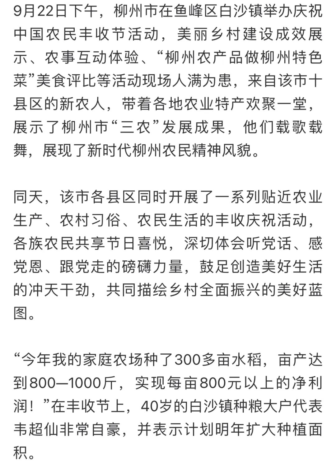 秋分至,金风拂面,凉爽宜人;田畴之间,五谷丰登,喜获丰收。昨日,我市庆祝中国农民丰收节活动暨鱼峰区特色农产品产销对接活动在鱼峰区白沙镇启动。