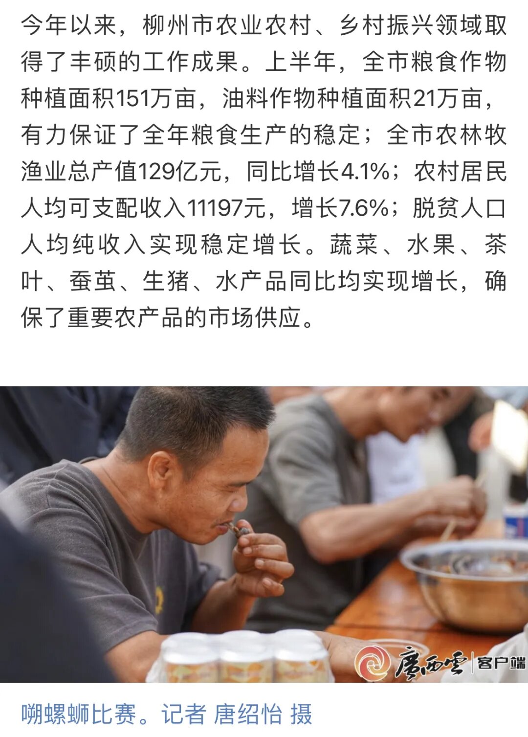 近年来,我市农业农村、乡村振兴领域成果颇丰。今年上半年,全市粮食作物种植面积151万亩,油料作物种植面积21万亩,有力保证了全年粮食生产的稳定;全市农林牧渔业总产值129亿元,同比增长4.1%;农村居民人均可支配收入11197元,同比增长7.6%;脱贫人口人均纯收入实现稳定增长。蔬菜、水果、茶叶、蚕茧、生猪、水产品同比均实现增长,确保了重要农产品的市场供应。今年以来,鱼峰区被评为2023年全国村庄清洁行动先进县,柳城县社冲乡荣获2024年国家级农业产业强镇,“柳州螺蛳粉”和“融安金桔”登上了2024年中国品牌价值区域品牌百强榜,三江侗族自治县被授予“全国优质早春茶核心产区”称号。
