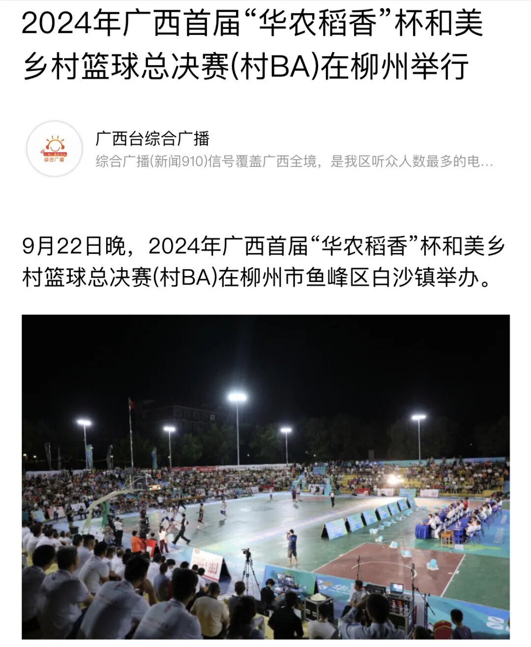 9月22日晚,2024年广西首届“华农稻香”杯和美乡村篮球总决赛(村BA)在柳州市鱼峰区白沙镇举办。