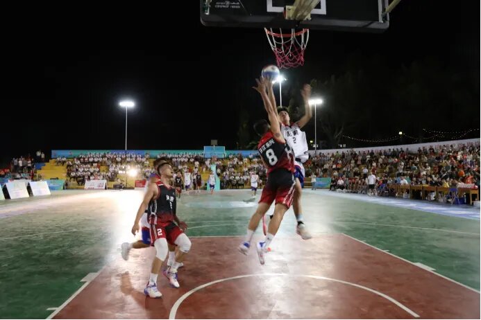 随着比赛哨声响起,河池市环江东兴镇球队的77号球员开场夺得第一个3分球,全场爆发热烈掌声。接下来的时间里,双方都展现了效率极高的进攻,防守反击、远投三分、扣篮……精湛的球技令观众大饱眼福。