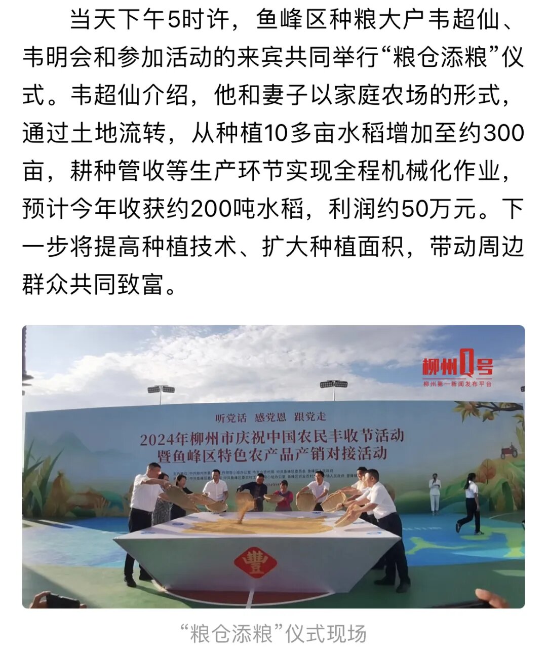 活动现场,鱼峰区种粮大户韦超仙、韦明会和参加活动的来宾共同举行“粮仓添粮”仪式。韦超仙介绍,他和妻子以家庭农场的形式,通过土地流转,种植水稻增加至约300亩,耕种管收等生产环节实现全程机械化作业,预计今年收获约200吨水稻,利润约50万元。下一步,他将提高种植技术、扩大种植面积,带动周边群众共同致富。