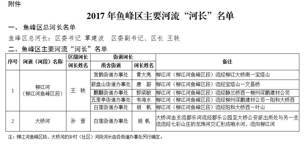 附件:鱼峰区总河长及主要河流“河长”花名册