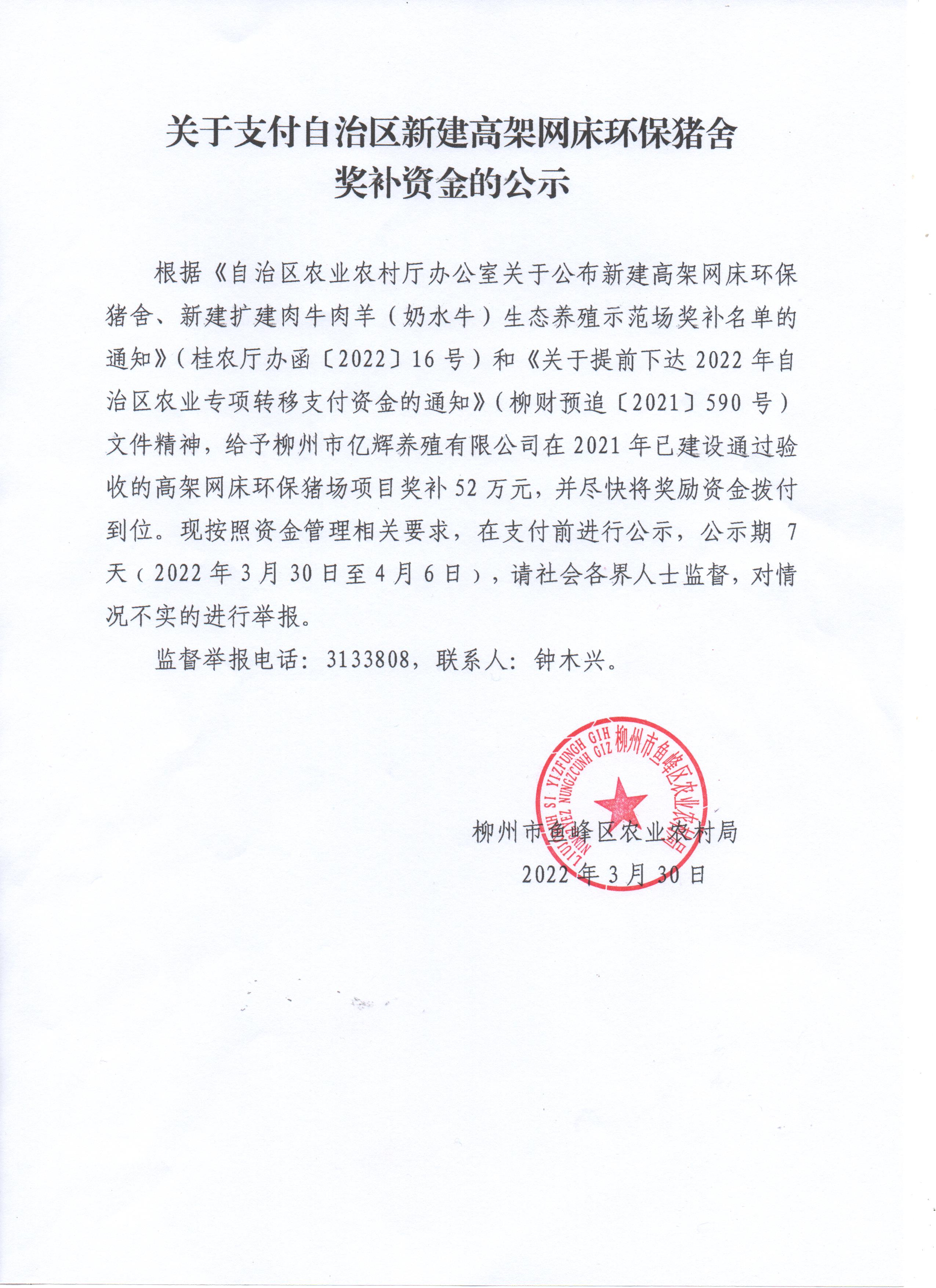 关于支付自治区新建高架网床环保猪舍奖补资金的公示