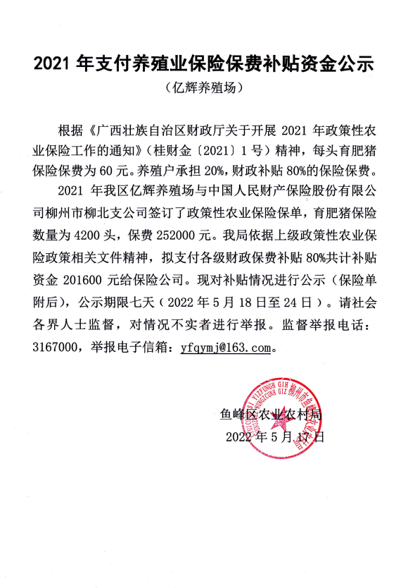 2021年支付养殖业保险保费补贴资金公示(亿辉养殖场)