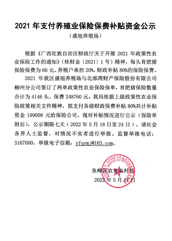 2021年支付养殖业保险保费补贴资金公示(盛旭养殖场)
