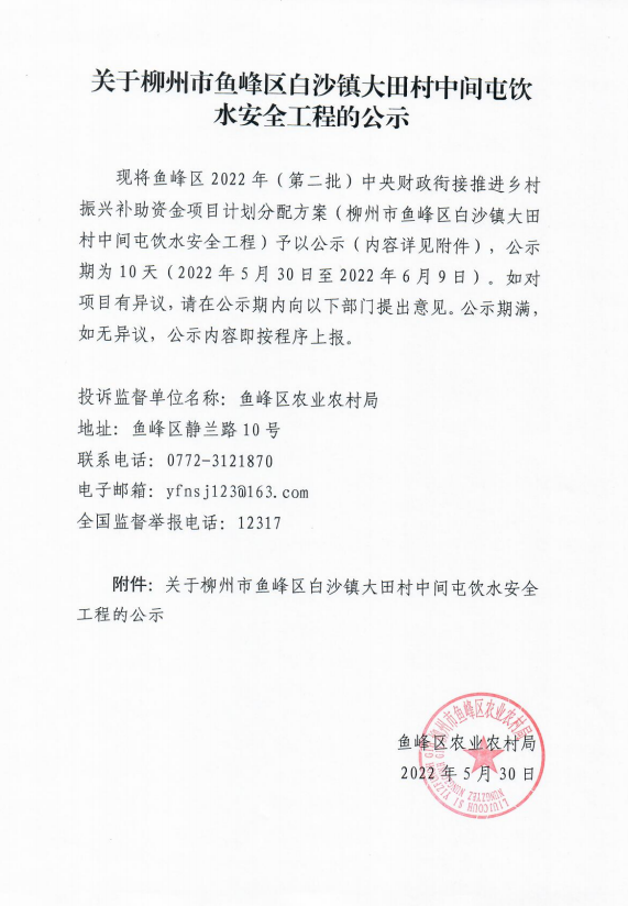 关于柳州市鱼峰区白沙镇大田村中间屯饮水安全工程的公示