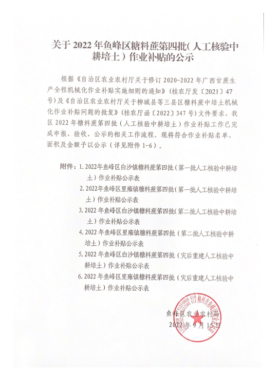 关于2022年鱼峰区糖料蔗第四批(人工核验中耕培土)作业补贴的公示