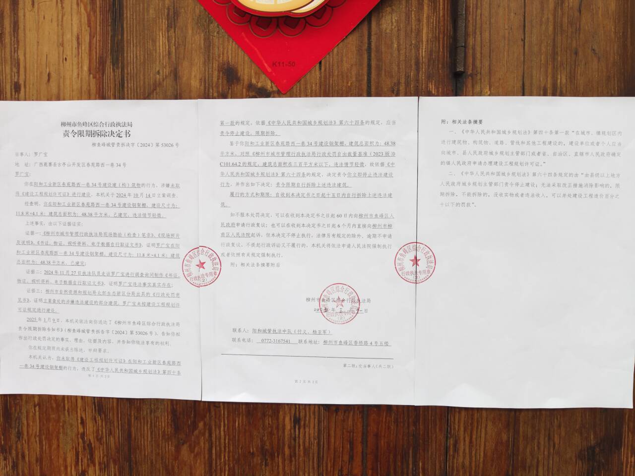 2025年3月11日,柳州市鱼峰区综合行政执法局依法作出《责令限期拆除决定书》(柳鱼峰城管责拆决字〔2024〕第53026号)。因采取直接送达、留置送达、邮寄送达等其他送达方式均无法向当事人罗广宝送达,为确保当事人的合法权益,根据《中华人民共和国民事诉讼法》第九十五条第一款,《中华人民共和国行政处罚法》第六十一条第一款,《住房和城乡建设行政处罚程序规定》第三十六条第二款之规定向罗广宝公告送达《责令限期拆除决定书》(柳鱼峰城管责拆决字〔2024〕第53026号),公告期为三十日,公告期满即视为送达。(本公告中的受送达对象:罗广宝)
