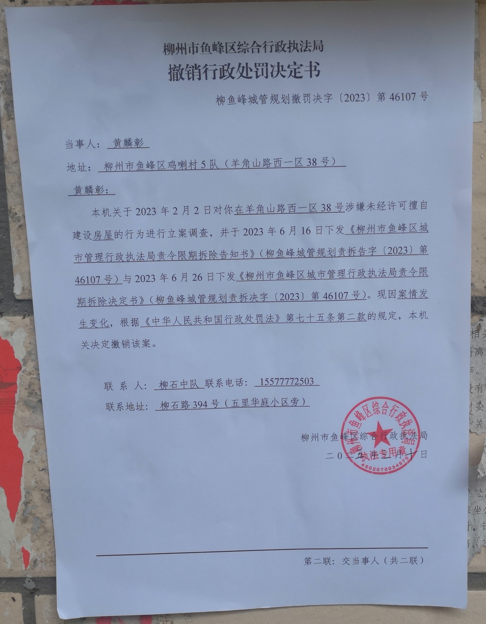 2025年3月10日,柳州市鱼峰区综合行政执法局依法作出《撤销行政处罚决定书》(柳鱼峰城管规划撤罚决字〔2023〕第46107号)。因采取直接送达、留置送达、邮寄送达等其他送达方式均无法向当事人黄麟彰送达,为确保当事人的合法权益,根据《中华人民共和国民事诉讼法》第九十五条第一款,《中华人民共和国行政处罚法》第六十一条第一款,《住房和城乡建设行政处罚程序规定》第三十六条第二款之规定向黄麟彰公告送达《撤销行政处罚决定书》(柳鱼峰城管规划撤罚决字〔2023〕第46107号),公告期为三十日,公告期满即视为送达。(本公告中的受送达对象:黄麟彰)