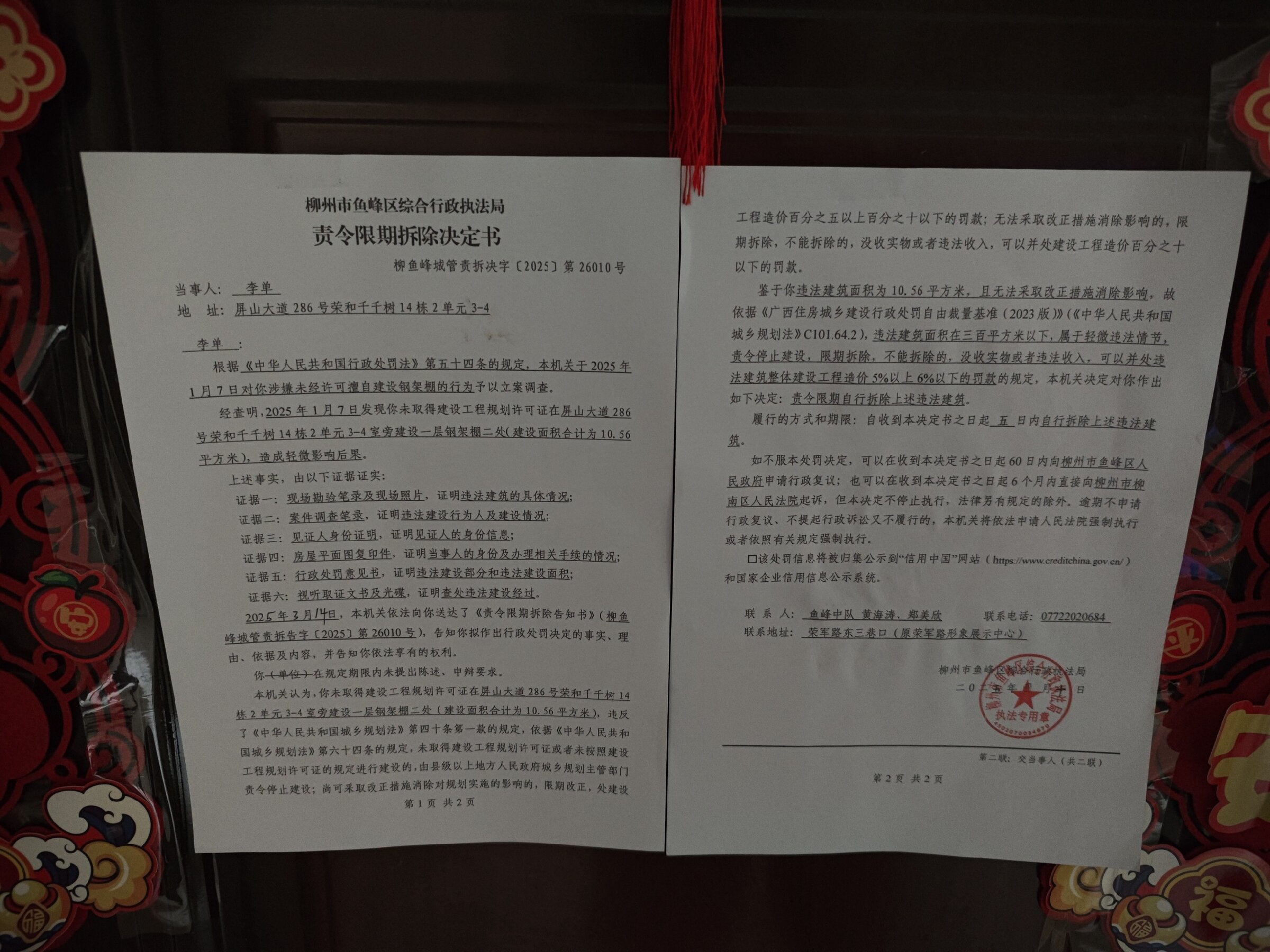 2025年4月10日,柳州市鱼峰区综合行政执法局依法作出《责令限期拆除决定书》(柳鱼峰城管责拆决字〔2025〕第26010号)。因采取直接送达、留置送达、邮寄送达等其他送达方式均无法向当事人李单送达,为确保当事人的合法权益,根据《中华人民共和国民事诉讼法》第九十五条第一款,《中华人民共和国行政处罚法》第六十一条第一款,《住房和城乡建设行政处罚程序规定》第三十六条第二款之规定向李单公告送达《责令限期拆除决定书》(柳鱼峰城管责拆决字〔2025〕第26010号),公告期为三十日,公告期满即视为送达。(本公告中的受送达对象:李单)