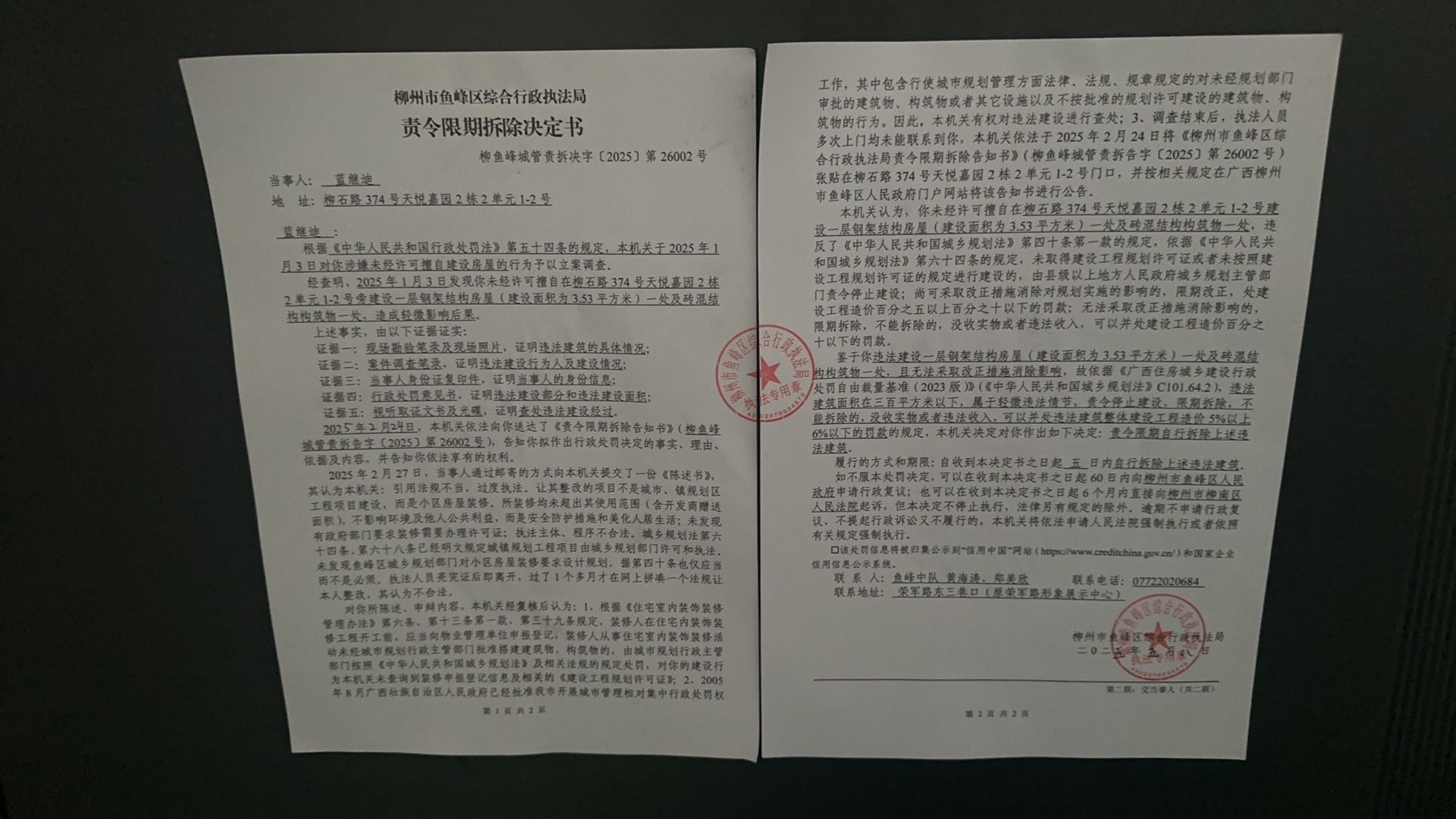 2025年5月8日,柳州市鱼峰区综合行政执法局依法作出《责令限期拆除决定书》(柳鱼峰城管责拆决字〔2025〕第26002号)。因采取直接送达、留置送达、邮寄送达等其他送达方式均无法向当事人蓝继迪送达,为确保当事人的合法权益,根据《中华人民共和国民事诉讼法》第九十五条第一款,《中华人民共和国行政处罚法》第六十一条第一款,《住房和城乡建设行政处罚程序规定》第三十六条第二款之规定向蓝继迪公告送达《责令限期拆除决定书》(柳鱼峰城管责拆决字〔2025〕第26002号),公告期为三十日,公告期满即视为送达。(本公告中的受送达对象:蓝继迪)