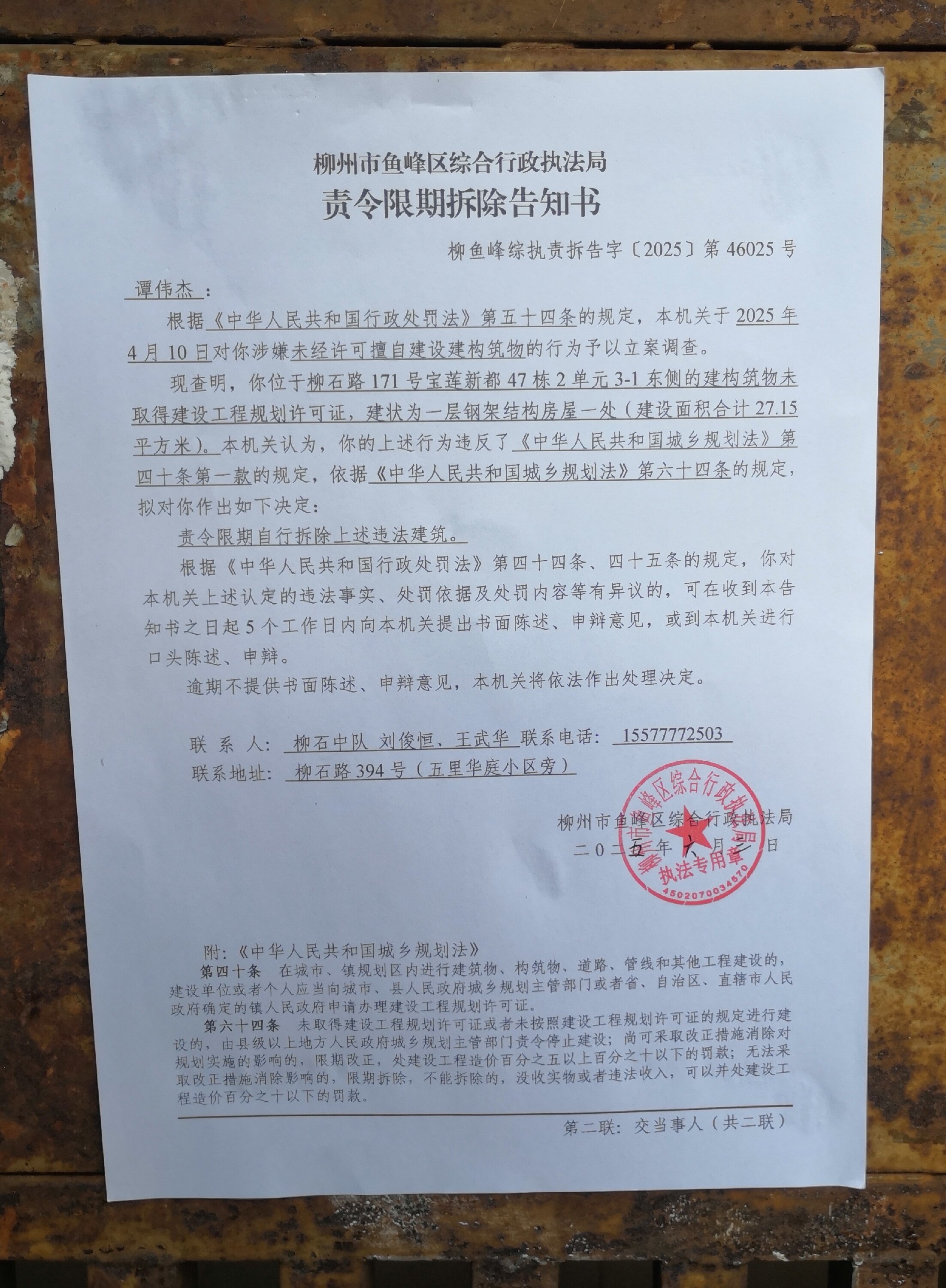 2025年6月3日,柳州市鱼峰区综合行政执法局依法作出《责令限期拆除告知书》(柳鱼峰综执责拆告字〔2025〕第46025号)。因采取直接送达、留置送达、邮寄送达等其他送达方式均无法向当事人谭伟杰送达,为确保当事人的合法权益,根据《中华人民共和国民事诉讼法》第九十五条第一款,《中华人民共和国行政处罚法》第六十一条第一款,《住房和城乡建设行政处罚程序规定》第三十六条第二款之规定向谭伟杰公告送达《责令限期拆除告知书》(柳鱼峰综执责拆告字〔2025〕第46025号),公告期为三十日,公告期满即视为送达。(本公告中的受送达对象:谭伟杰)