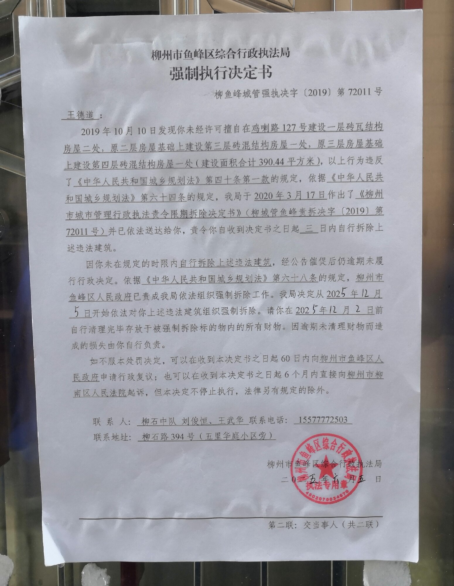 2025年6月5日,柳州市鱼峰区综合行政执法局依法作出《强制执行决定书》(柳鱼峰城管强执决字〔2019〕第72011号)。因采取直接送达、留置送达、邮寄送达等其他送达方式均无法向当事人王德道送达,为确保当事人的合法权益,根据《中华人民共和国民事诉讼法》第九十五条第一款,《中华人民共和国行政处罚法》第六十一条第一款,《住房和城乡建设行政处罚程序规定》第三十六条第二款之规定向王德道公告送达《强制执行决定书》(柳鱼峰城管强执决字〔2019〕第72011号),公告期为三十日,公告期满即视为送达。(本公告中的受送达对象:王德道)