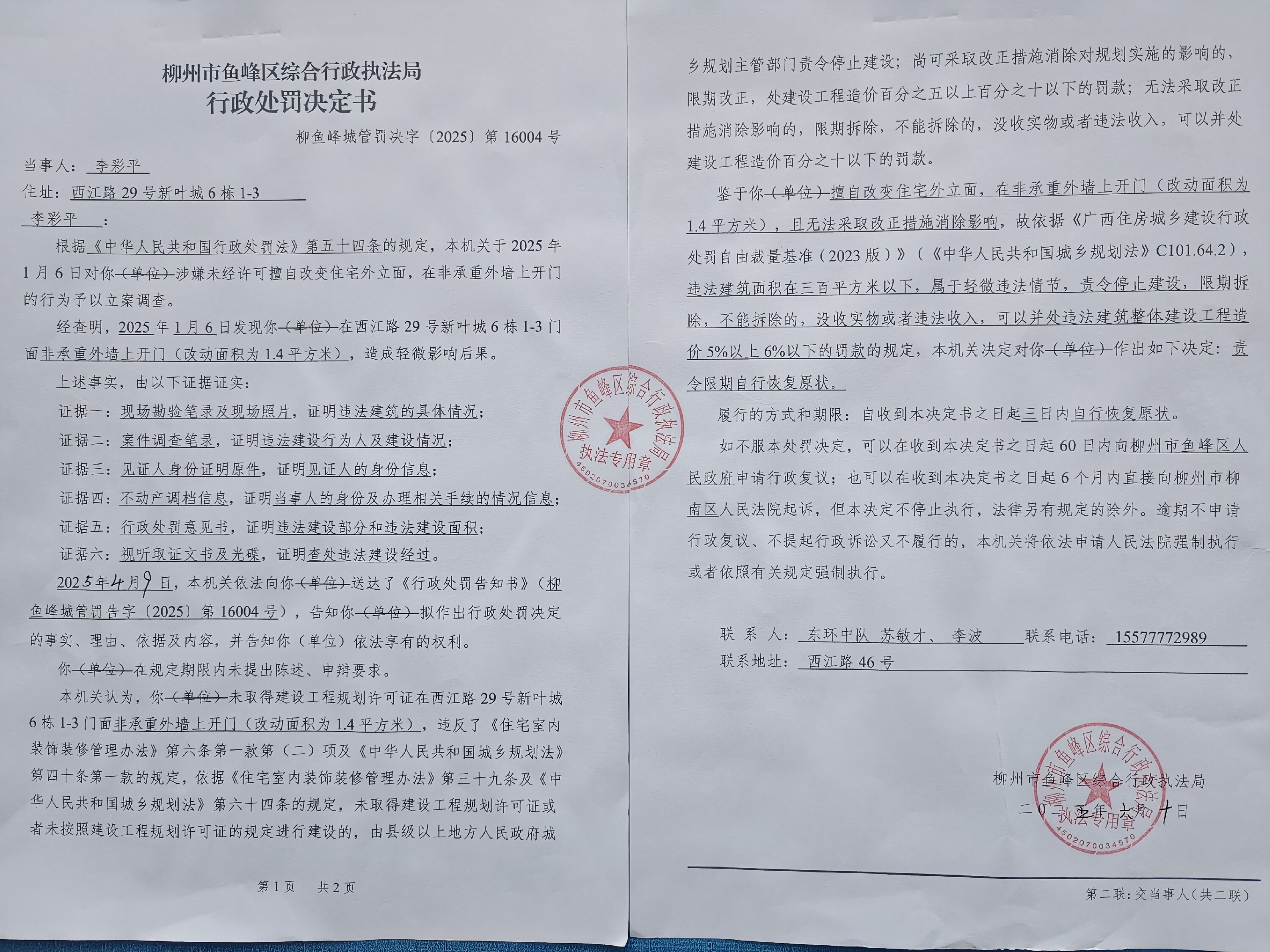 2025年6月10日,柳州市鱼峰区综合行政执法局依法作出《行政处罚决定书》(柳鱼峰城管罚决字〔2025〕第16004号)。因采取直接送达、留置送达、邮寄送达等其他送达方式均无法向当事人李彩平送达,为确保当事人的合法权益,根据《中华人民共和国民事诉讼法》第九十五条第一款,《中华人民共和国行政处罚法》第六十一条第一款,《住房和城乡建设行政处罚程序规定》第三十六条第二款之规定向李彩平公告送达《行政处罚决定书》(柳鱼峰城管罚决字〔2025〕第16004号),公告期为三十日,公告期满即视为送达。(本公告中的受送达对象:李彩平)