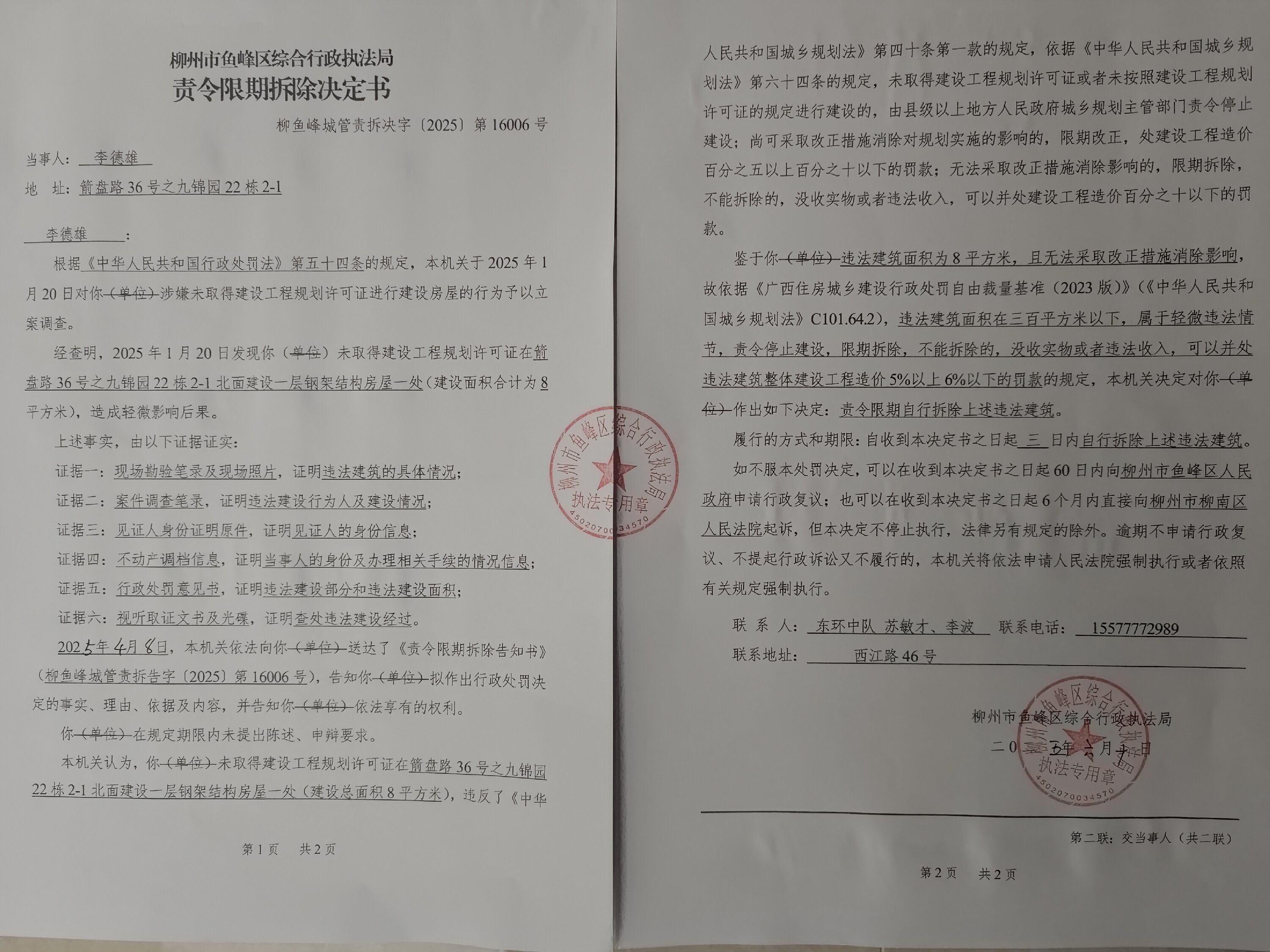 2025年6月10日,柳州市鱼峰区综合行政执法局依法作出《责令限期拆除决定书》(柳鱼峰城管责拆决字〔2025〕第16006号)。因采取直接送达、留置送达、邮寄送达等其他送达方式均无法向当事人李德雄送达,为确保当事人的合法权益,根据《中华人民共和国民事诉讼法》第九十五条第一款,《中华人民共和国行政处罚法》第六十一条第一款,《住房和城乡建设行政处罚程序规定》第三十六条第二款之规定向李德雄公告送达《责令限期拆除决定书》(柳鱼峰城管责拆决字〔2025〕第16006号),公告期为三十日,公告期满即视为送达。(本公告中的受送达对象:李德雄)