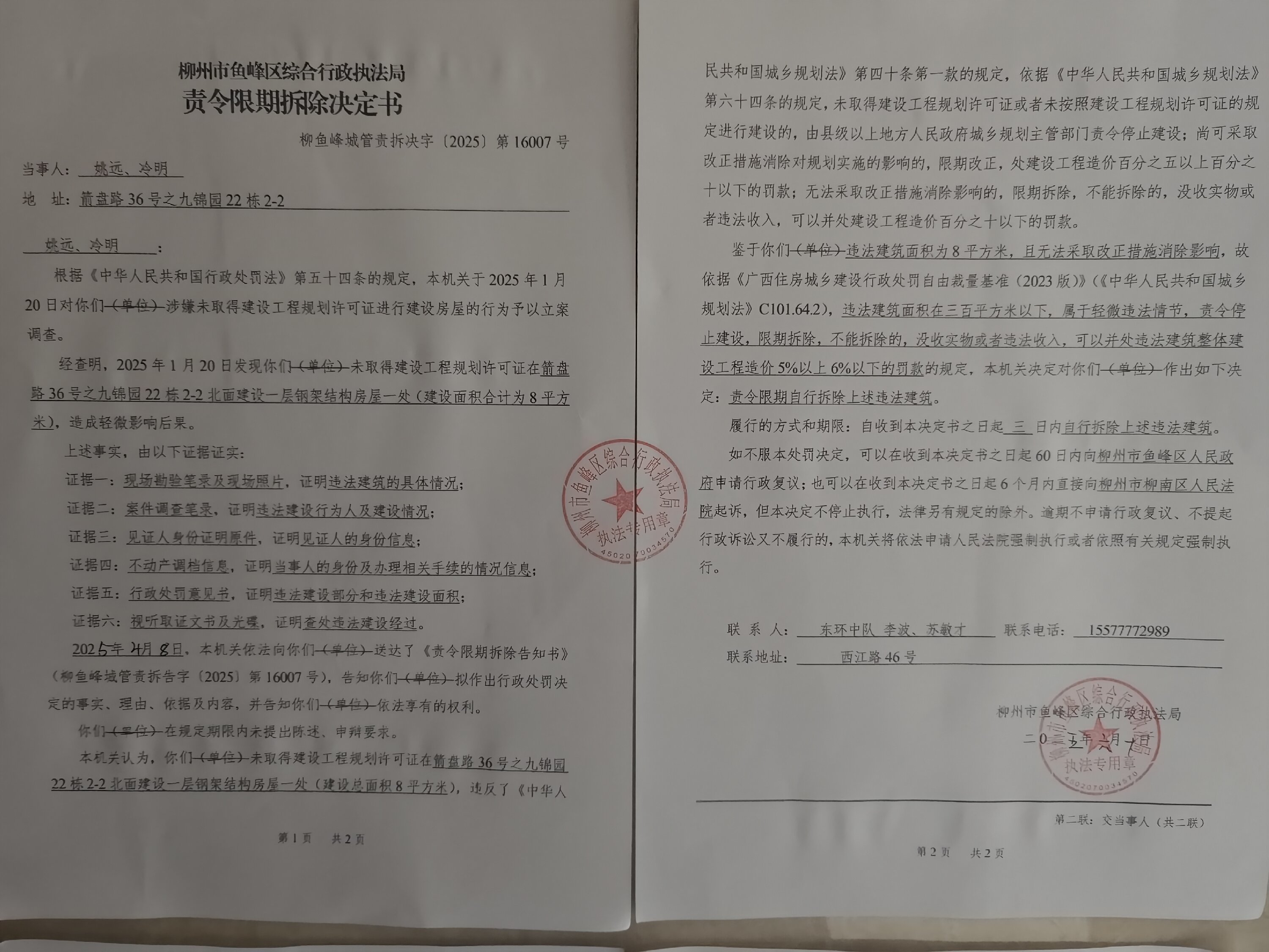 2025年6月10日,柳州市鱼峰区综合行政执法局依法作出《责令限期拆除决定书》(柳鱼峰城管责拆决字〔2025〕第16007号)。因采取直接送达、留置送达、邮寄送达等其他送达方式均无法向当事人姚远、冷明送达,为确保当事人的合法权益,根据《中华人民共和国民事诉讼法》第九十五条第一款,《中华人民共和国行政处罚法》第六十一条第一款,《住房和城乡建设行政处罚程序规定》第三十六条第二款之规定向姚远、冷明公告送达《责令限期拆除决定书》(柳鱼峰城管责拆决字〔2025〕第16007号),公告期为三十日,公告期满即视为送达。(本公告中的受送达对象:姚远、冷明)