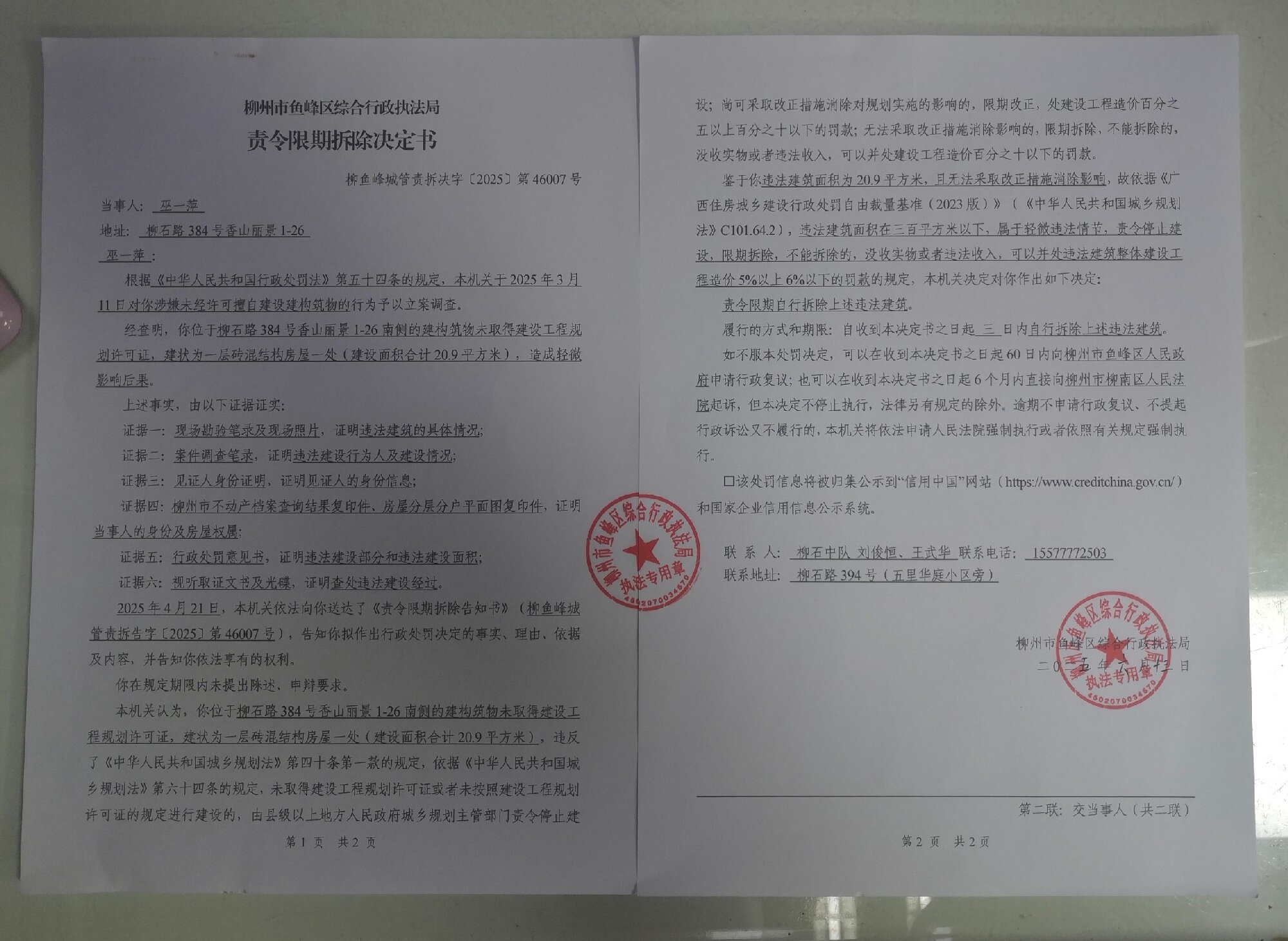 2025年6月13日,柳州市鱼峰区综合行政执法局依法作出《责令限期拆除决定书》(柳鱼峰城管责拆决字〔2025〕第46007号)。因采取直接送达、留置送达、邮寄送达等其他送达方式均无法向当事人巫一萍送达,为确保当事人的合法权益,根据《中华人民共和国民事诉讼法》第九十五条第一款,《中华人民共和国行政处罚法》第六十一条第一款,《住房和城乡建设行政处罚程序规定》第三十六条第二款之规定向巫一萍公告送达《责令限期拆除决定书》(柳鱼峰城管责拆决字〔2025〕第46007号),公告期为三十日,公告期满即视为送达。(本公告中的受送达对象:巫一萍)