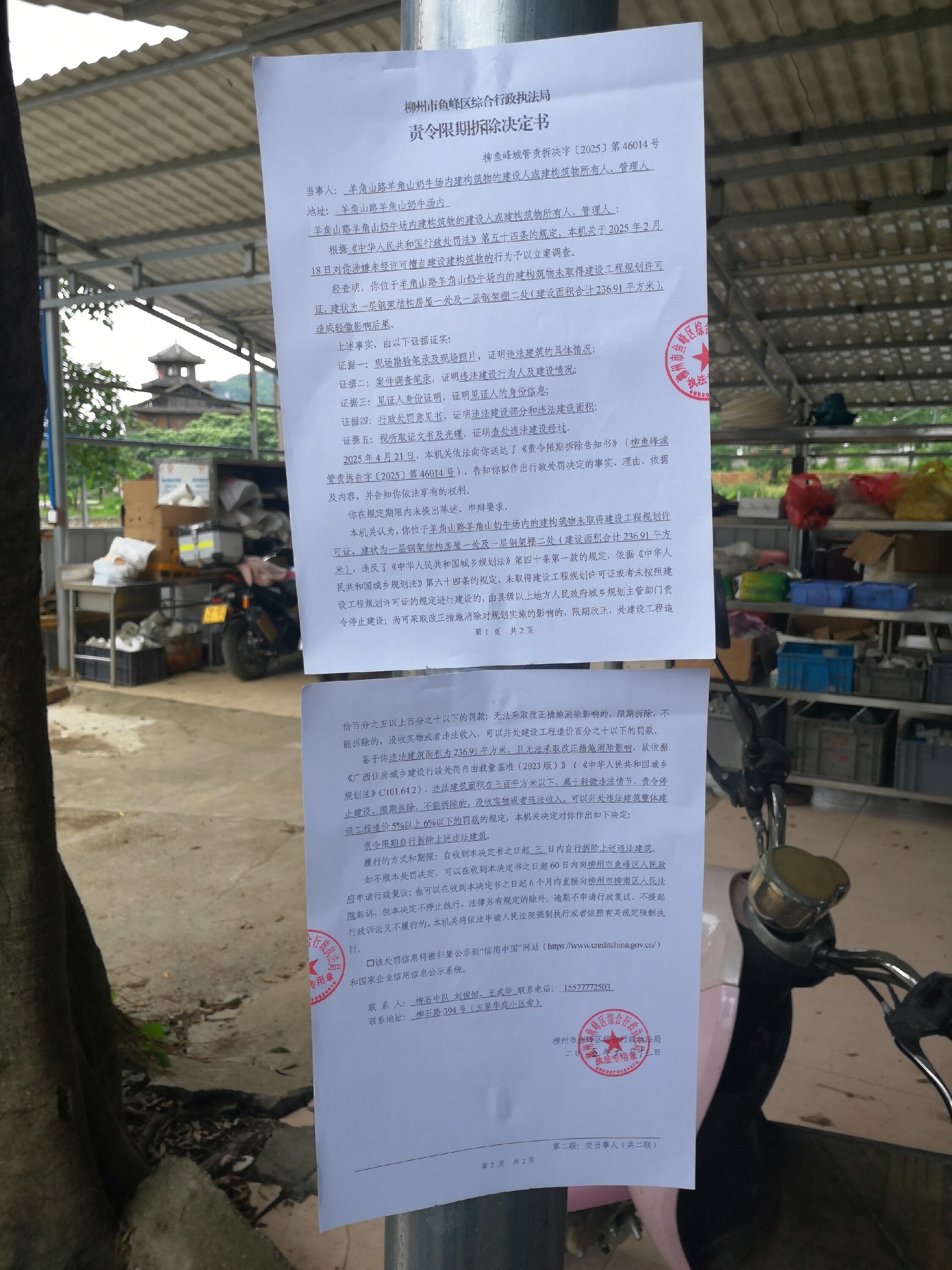 2025年6月13日,柳州市鱼峰区综合行政执法局依法作出《责令限期拆除决定书》(柳鱼峰城管责拆决字〔2025〕第46014号)。因采取直接送达、留置送达、邮寄送达等其他送达方式均无法向当事人送达,为确保当事人的合法权益,根据《中华人民共和国民事诉讼法》第九十五条第一款,《中华人民共和国行政处罚法》第六十一条第一款,《住房和城乡建设行政处罚程序规定》第三十六条第二款之规定向当事人公告送达《责令限期拆除决定书》(柳鱼峰城管责拆决字〔2025〕第46014号),公告期为三十日,公告期满即视为送达。