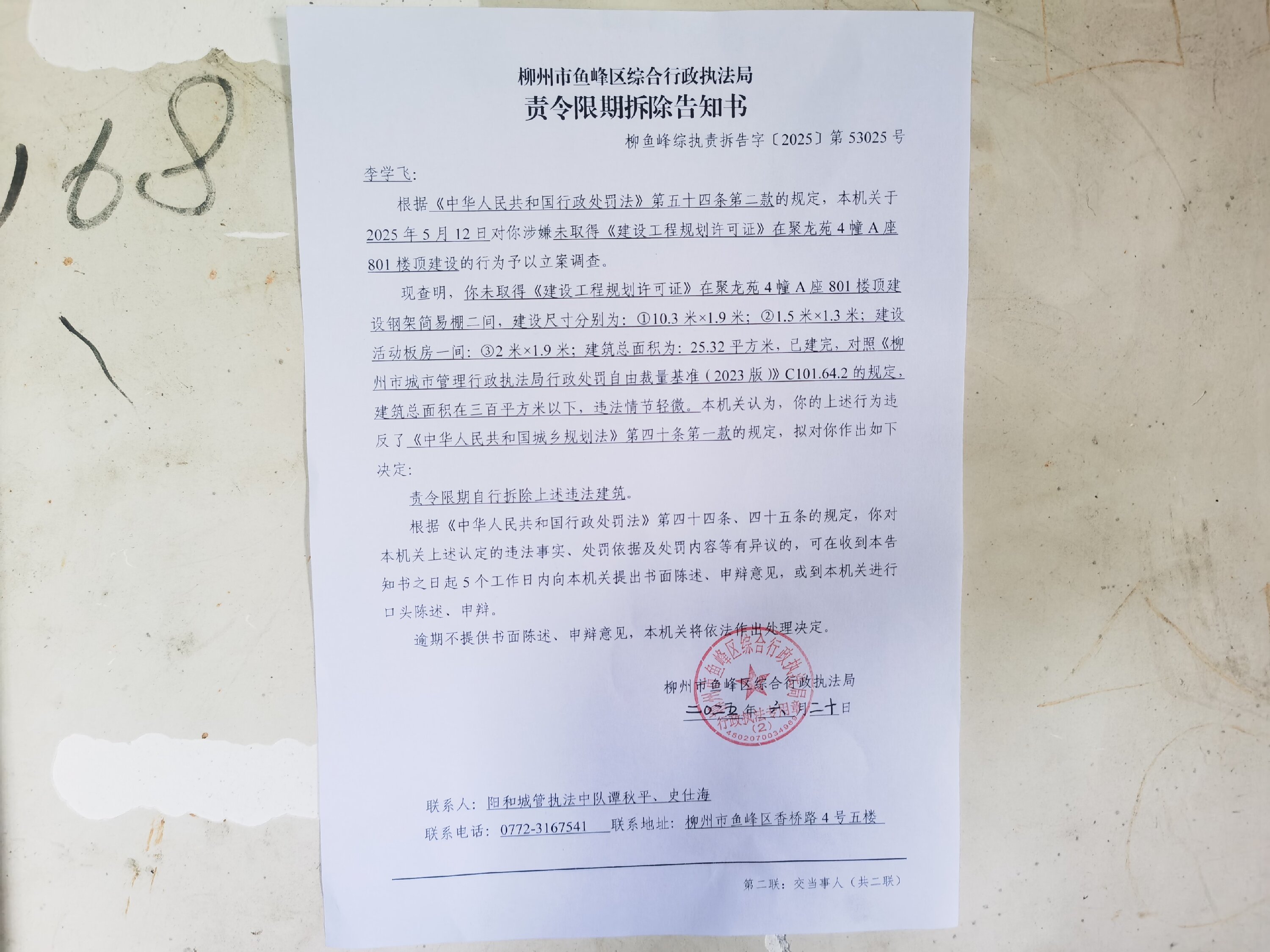 2025年6月20日,柳州市鱼峰区综合行政执法局依法作出《责令限期拆除告知书》(柳鱼峰综执责拆告字〔2025〕第53025号)。因采取直接送达、留置送达、邮寄送达等其他送达方式均无法向当事人李学飞送达,为确保当事人的合法权益,根据《中华人民共和国民事诉讼法》第九十五条第一款,《中华人民共和国行政处罚法》第六十一条第一款,《住房和城乡建设行政处罚程序规定》第三十六条第二款之规定向李学飞公告送达《责令限期拆除告知书》(柳鱼峰综执责拆告字〔2025〕第53025号),公告期为三十日,公告期满即视为送达。(本公告中的受送达对象:李学飞)