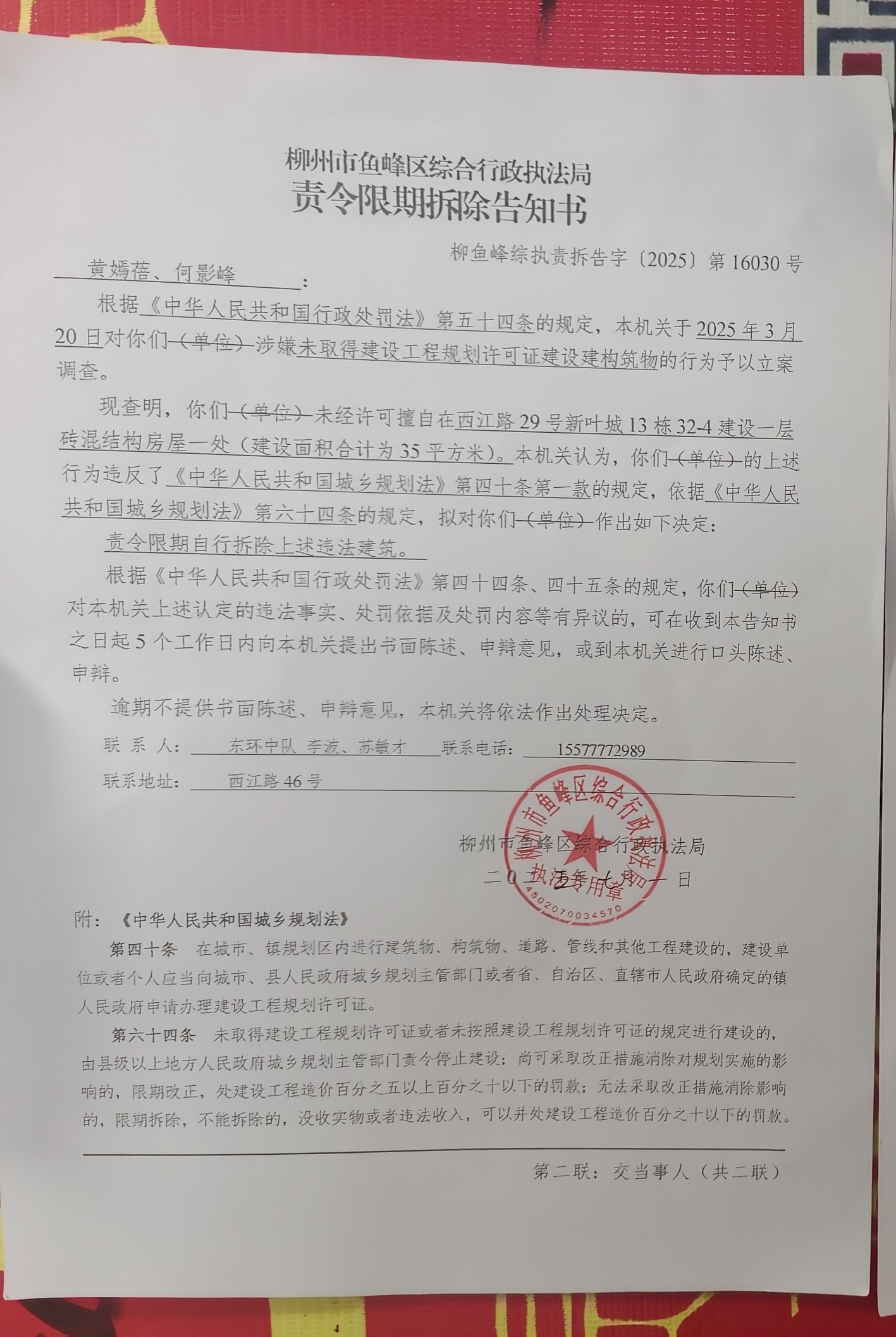 2025年7月1日,柳州市鱼峰区综合行政执法局依法作出《责令限期拆除告知书》(柳鱼峰综执责拆告字〔2025〕第16030号)。因采取直接送达、留置送达、邮寄送达等其他送达方式均无法向当事人黄嫣蓓、何影峰送达,为确保当事人的合法权益,根据《中华人民共和国民事诉讼法》第九十五条第一款,《中华人民共和国行政处罚法》第六十一条第一款,《住房和城乡建设行政处罚程序规定》第三十六条第二款之规定向黄嫣蓓、何影峰公告送达《责令限期拆除告知书》(柳鱼峰综执责拆告字〔2025〕第16030号),公告期为三十日,公告期满即视为送达。(本公告中的受送达对象:黄嫣蓓、何影峰)