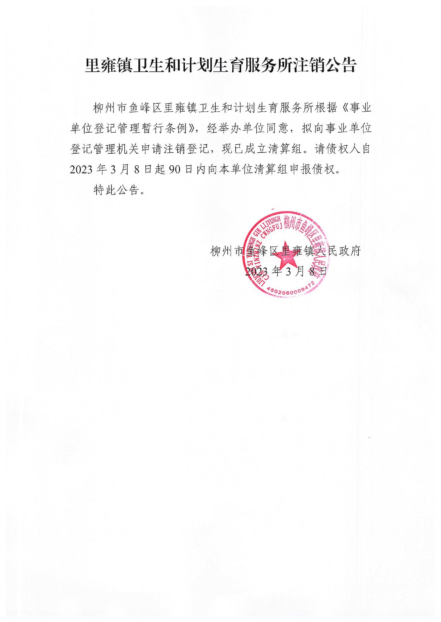 里雍镇卫生和计划生育所注销公告