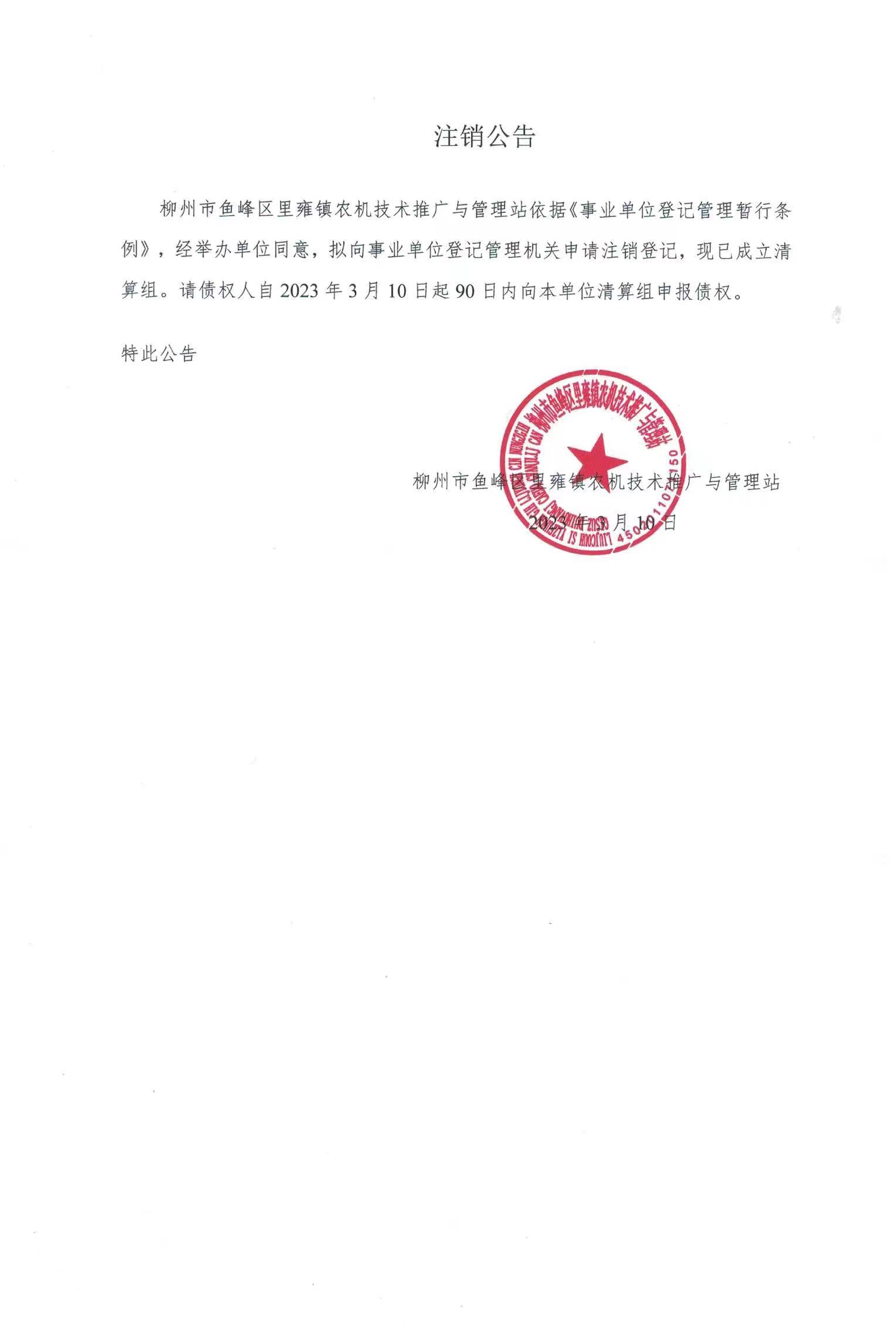 鱼峰区里雍镇农机技术推广与管理站注销公告