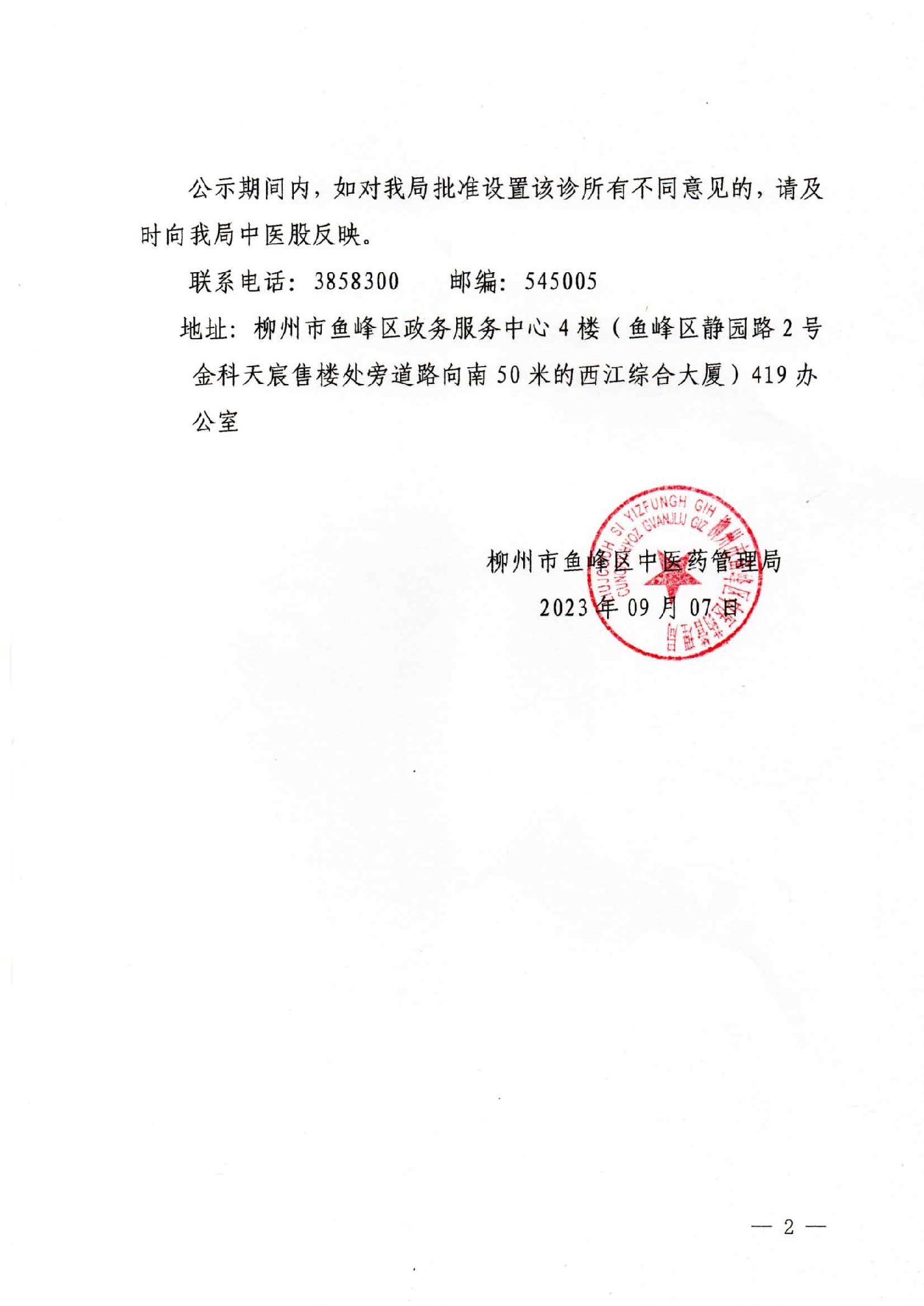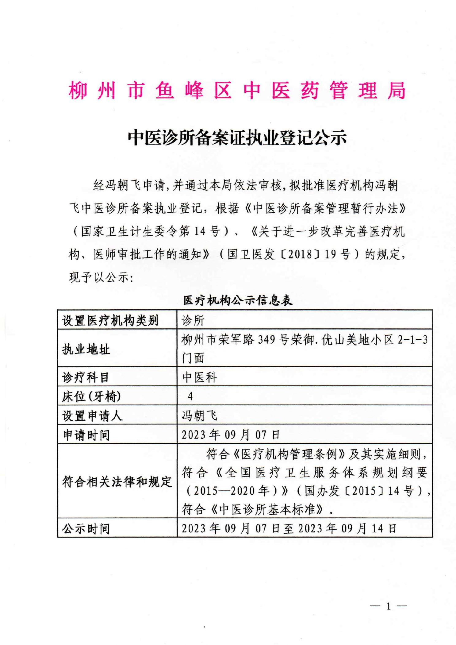 柳州市鱼峰区中医药管理局中医诊所备案证执业登记公示( 冯朝飞中医诊所)