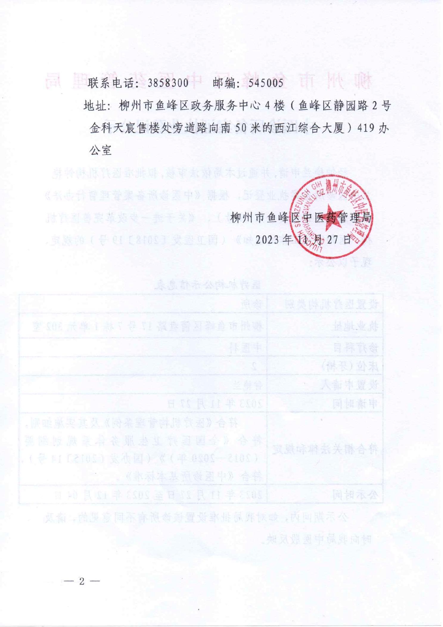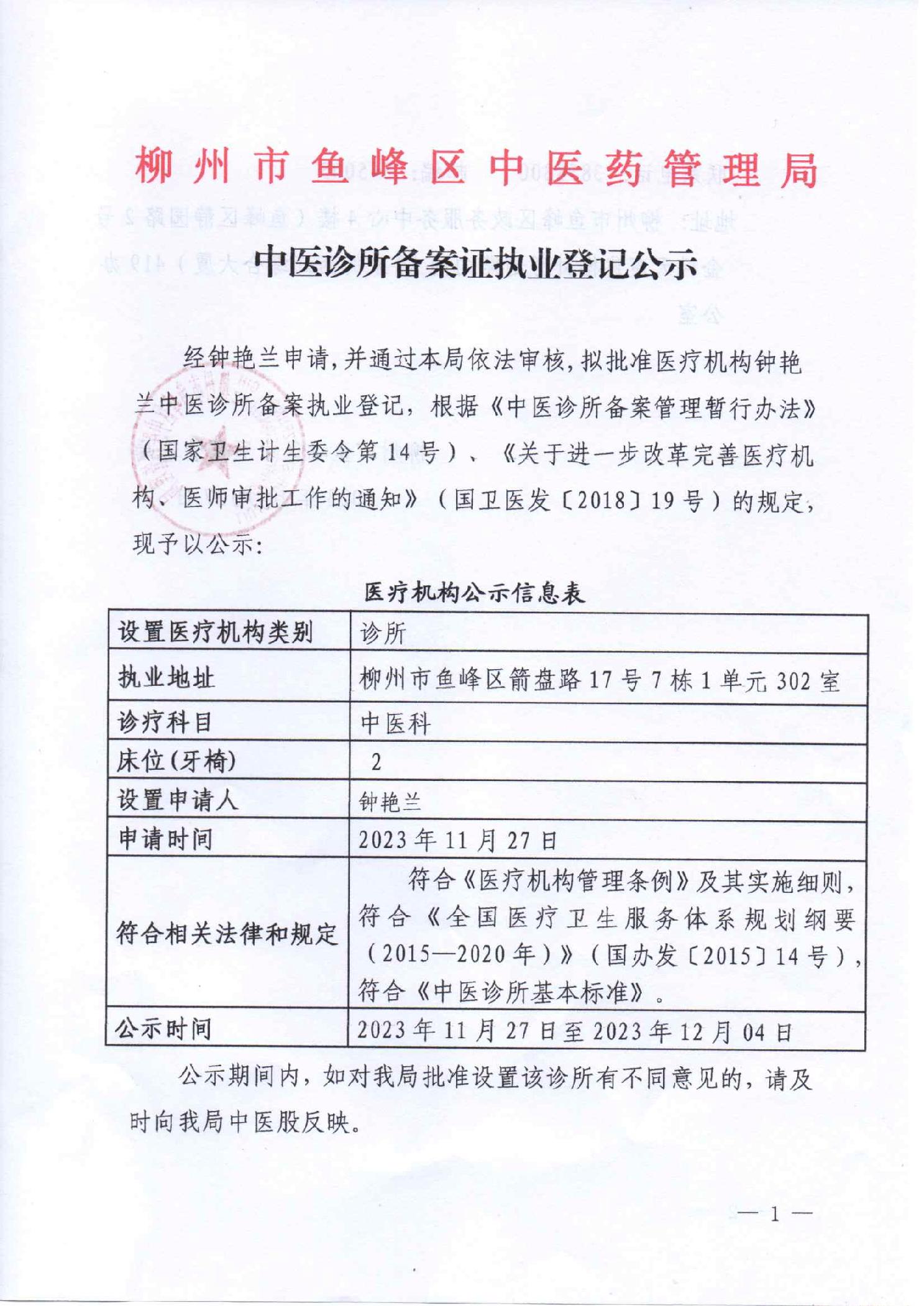 柳州市鱼峰区中医药管理局中医诊所备案证执业登记公示(钟艳兰中医诊所)