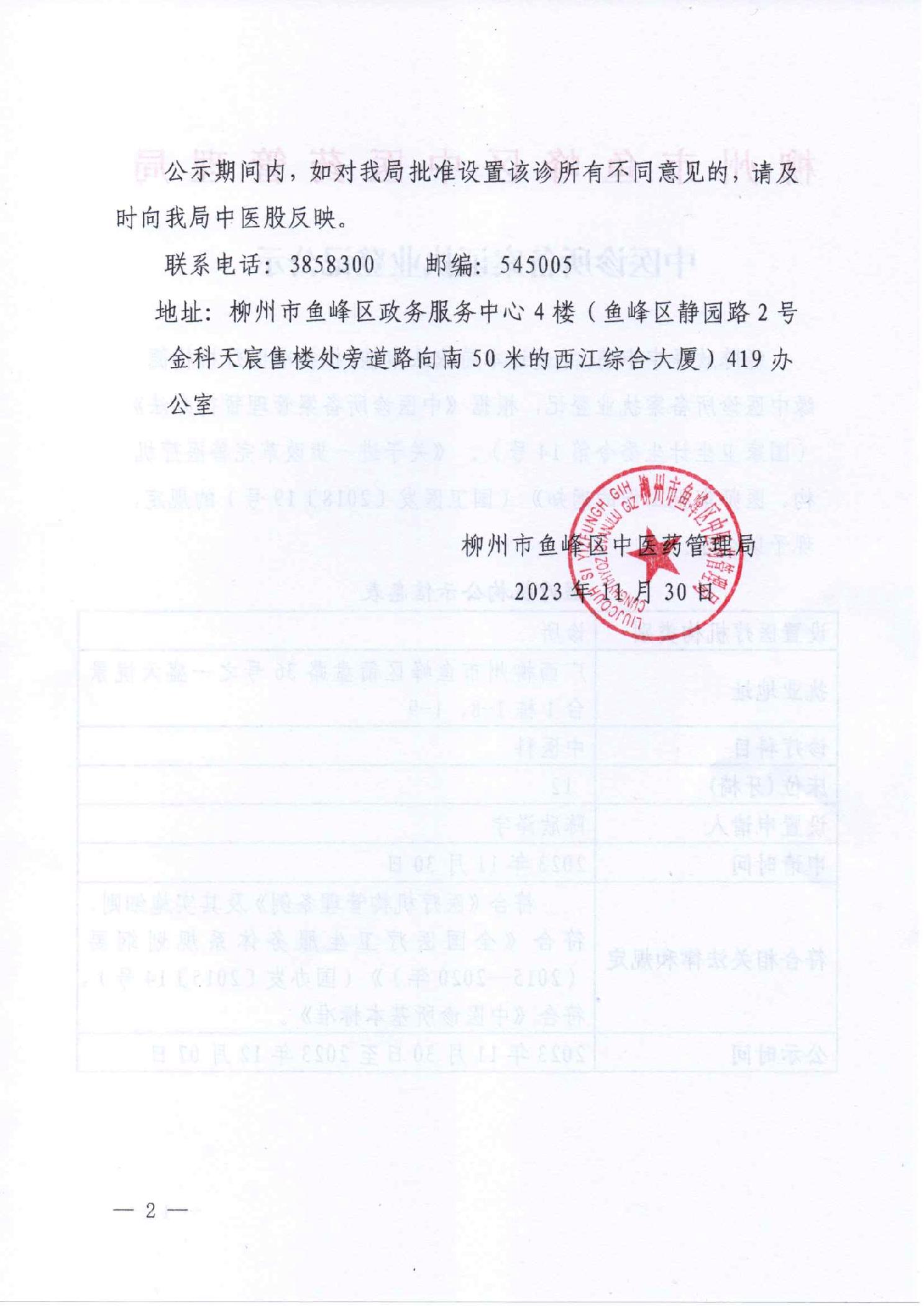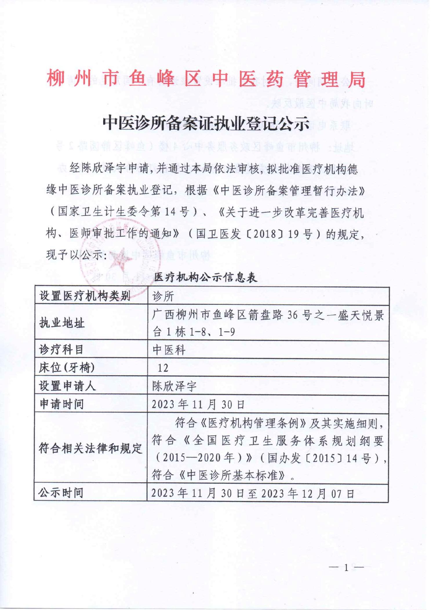 柳州市鱼峰区中医药管理局中医诊所备案证执业登记公示(德缘中医诊所)