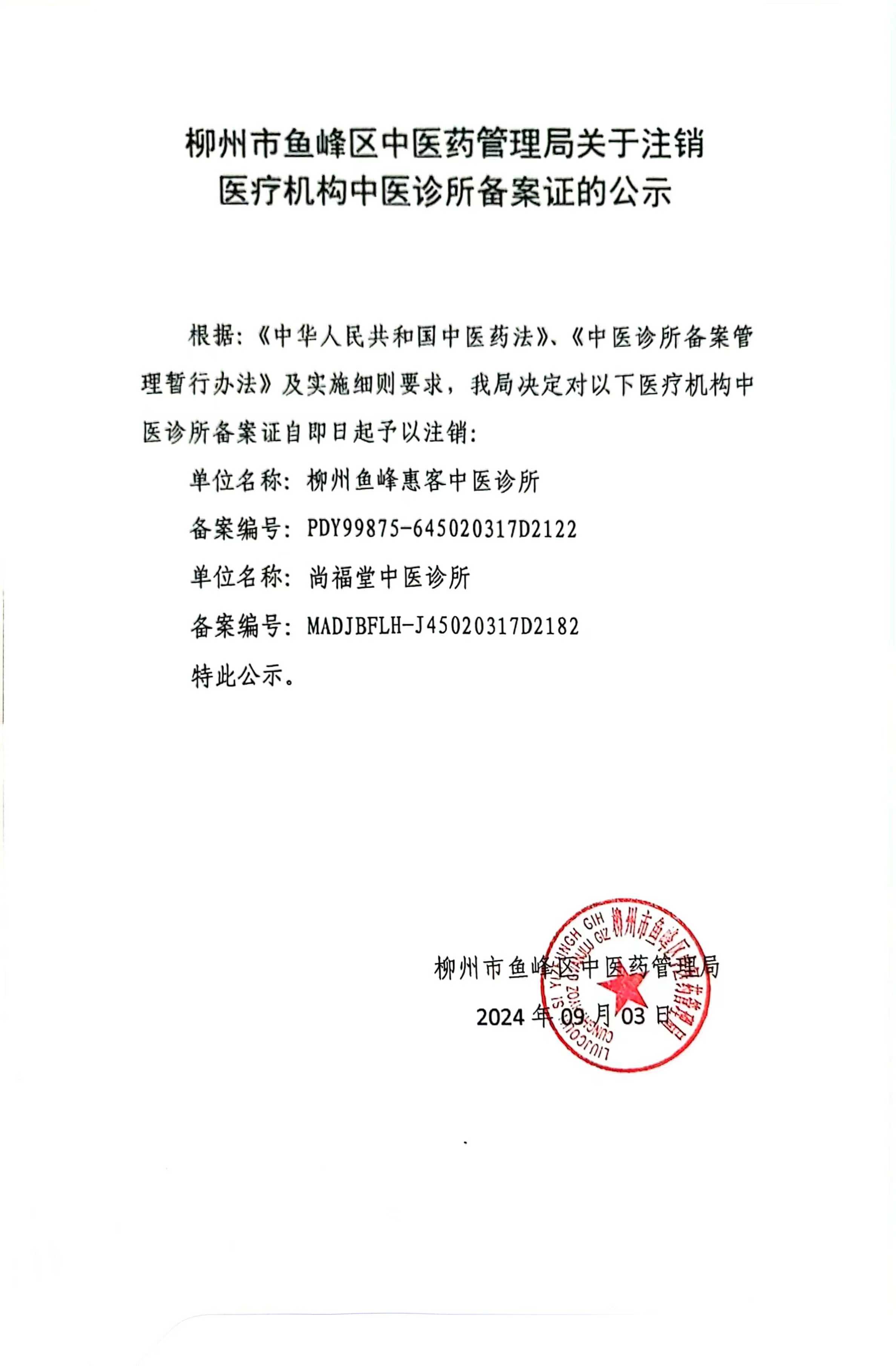 柳州市鱼峰区中医药管理局关于注销医疗机构中医诊所备案证的公示