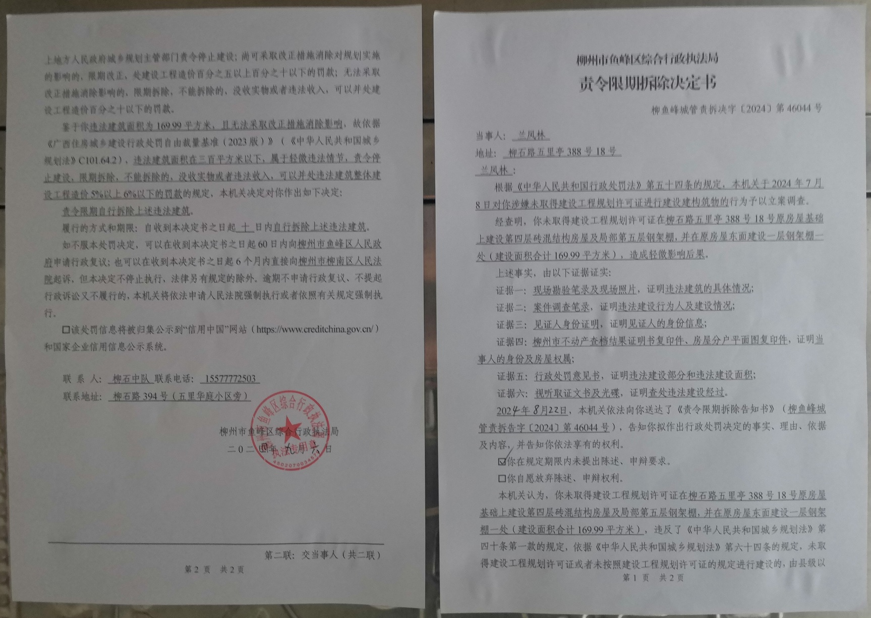 2024年9月6日,柳州市鱼峰区综合行政执法局依法作出《责令限期拆除决定书》(柳鱼峰城管责拆决字〔2024〕第46044号)。因采取直接送达、留置送达、邮寄送达等其他送达方式均无法向当事人兰凤林送达,为确保当事人的合法权益,根据《中华人民共和国民事诉讼法》第九十五条第一款,《中华人民共和国行政处罚法》第六十一条第一款,《住房和城乡建设行政处罚程序规定》第三十六条第二款之规定向兰凤林公告送达《责令限期拆除决定书》(柳鱼峰城管责拆决字〔2024〕第46044号),公告期为三十日,公告期满即视为送达。(本公告中的受送达对象:兰凤林)