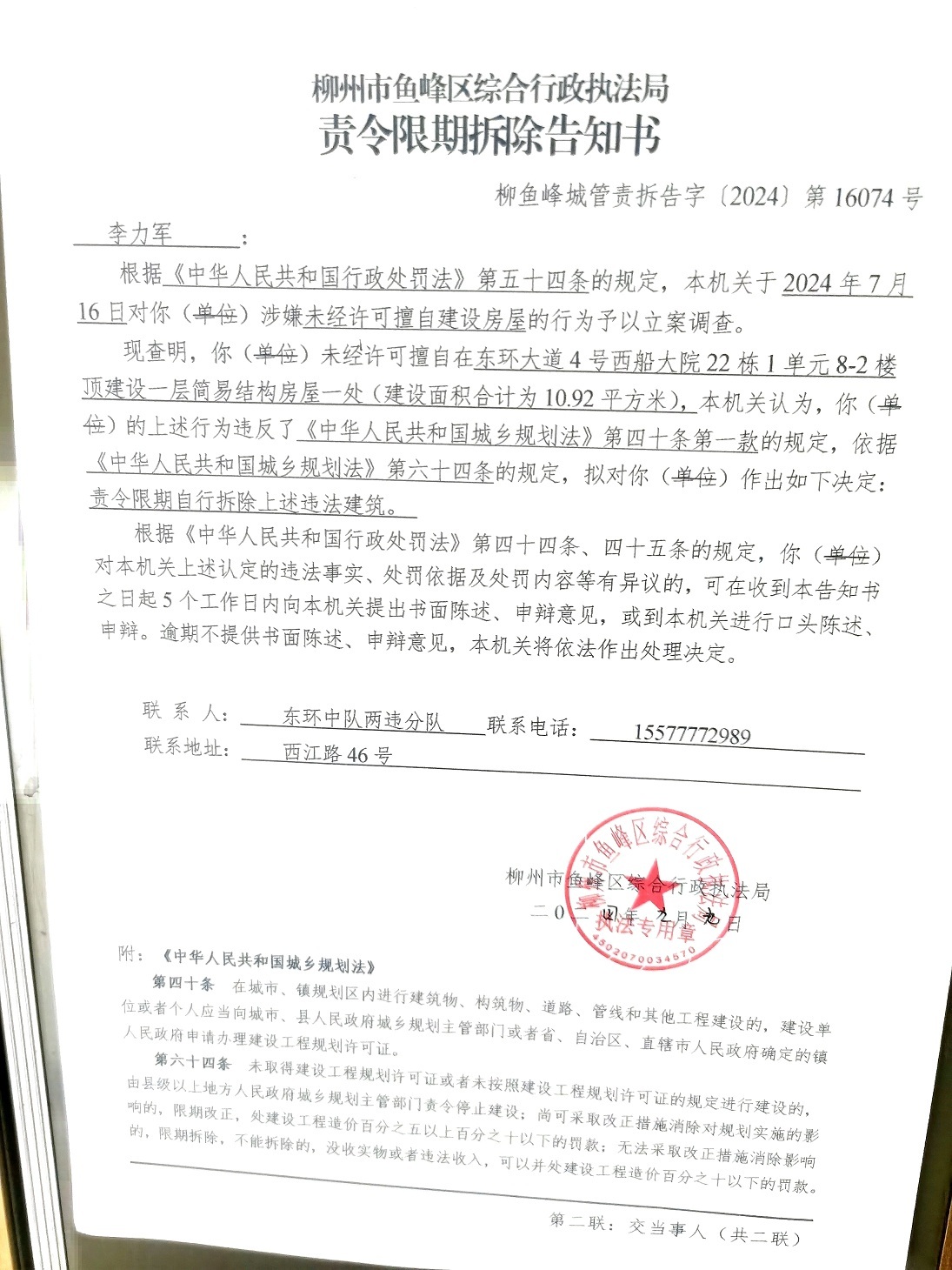 2024年9月9日,柳州市鱼峰区综合行政执法局依法作出《责令限期拆除告知书》(柳鱼峰城管责拆告字〔2024〕第16074号)。因采取直接送达、留置送达、邮寄送达等其他送达方式均无法向当事人李力军送达,为确保当事人的合法权益,根据《中华人民共和国民事诉讼法》第九十五条第一款,《中华人民共和国行政处罚法》第六十一条第一款,《住房和城乡建设行政处罚程序规定》第三十六条第二款之规定向李力军公告送达《责令限期拆除告知书》(柳鱼峰城管责拆告字〔2024〕第16074号),公告期为三十日,公告期满即视为送达。(本公告中的受送达对象:李力军)