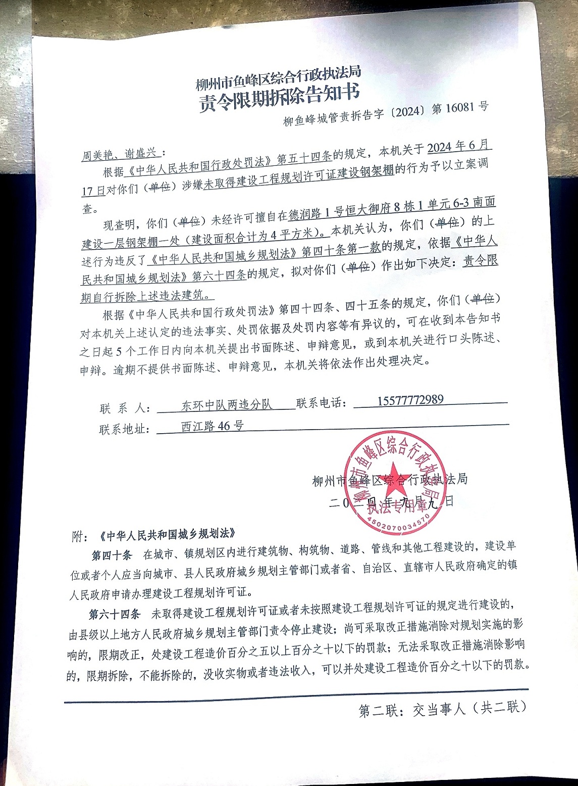 2024年9月9日,柳州市鱼峰区综合行政执法局依法作出《责令限期拆除告知书》(柳鱼峰城管责拆告字〔2024〕第16081号)。因采取直接送达、留置送达、邮寄送达等其他送达方式均无法向当事人周美艳、谢盛兴送达,为确保当事人的合法权益,根据《中华人民共和国民事诉讼法》第九十五条第一款,《中华人民共和国行政处罚法》第六十一条第一款,《住房和城乡建设行政处罚程序规定》第三十六条第二款之规定向周美艳、谢盛兴公告送达《责令限期拆除告知书》(柳鱼峰城管责拆告字〔2024〕第16081号),公告期为三十日,公告期满即视为送达。(本公告中的受送达对象:周美艳、谢盛兴)