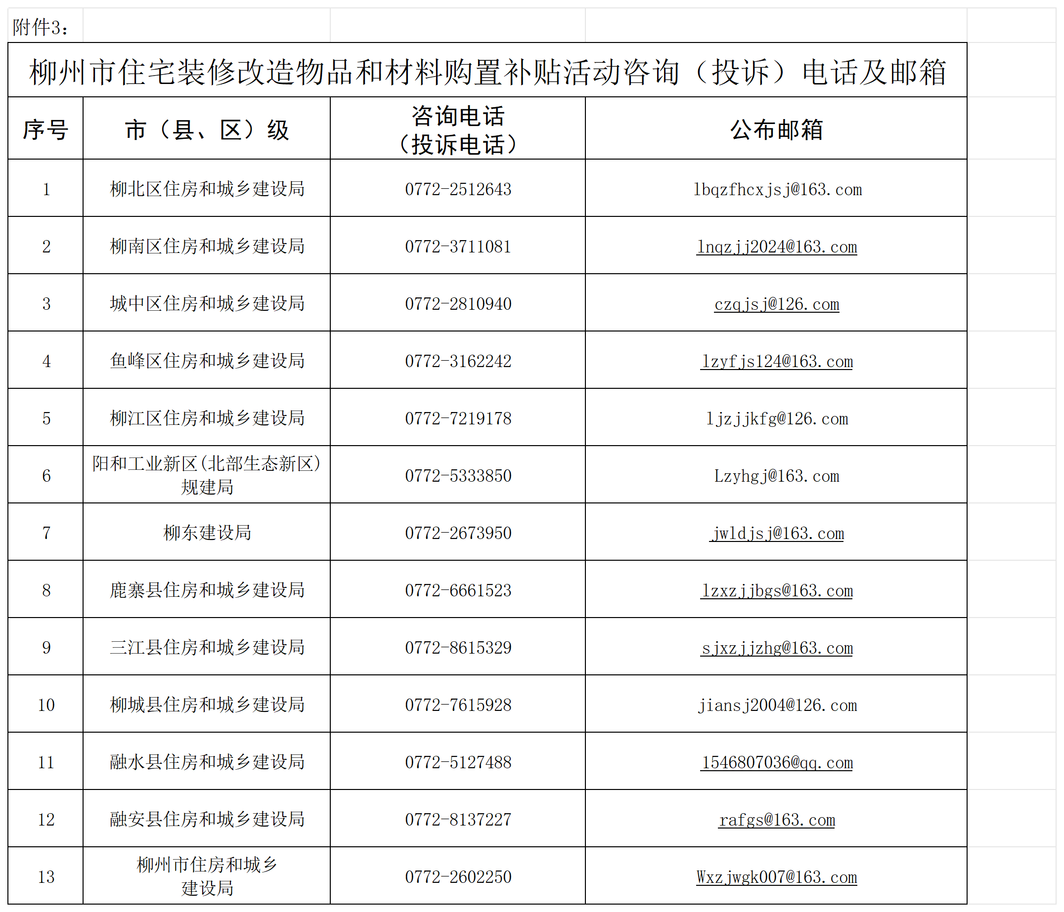 3.柳州市住宅装修改造物品和材料购置补贴活动咨询(投诉)电话及邮箱