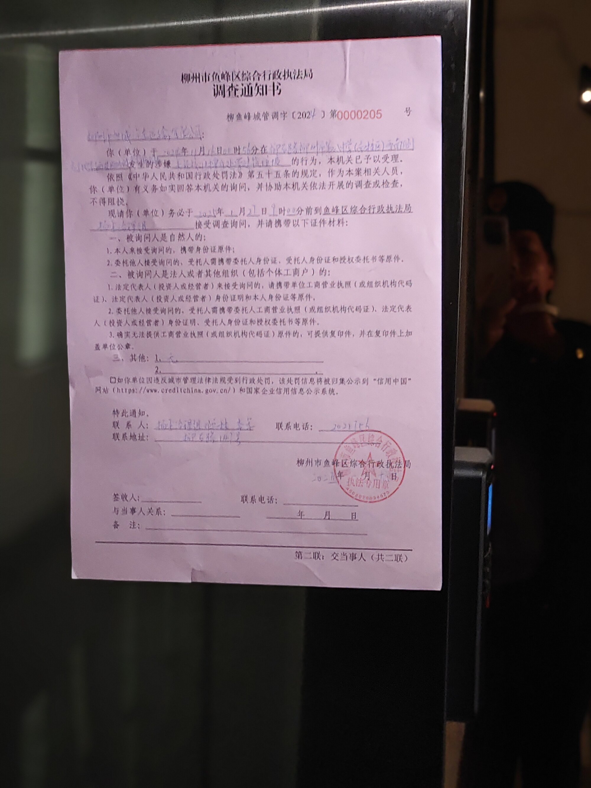 2025年1月26日,柳州市鱼峰区综合行政执法局依法作出《调查通知书》(柳鱼峰城管调字〔2024〕第0000205号)。因采取直接送达、留置送达、邮寄送达等其他送达方式均无法向当事人柳州市恒城汽车运输有限公司送达,为确保当事人的合法权益,根据《中华人民共和国民事诉讼法》第九十五条第一款,《中华人民共和国行政处罚法》第六十一条第一款,《住房和城乡建设行政处罚程序规定》第三十六条第二款之规定向柳州市恒城汽车运输有限公司公告送达《调查通知书》(柳鱼峰城管调字〔2024〕第0000205号),公告期为三十日,公告期满即视为送达。(本公告中的受送达对象:柳州市恒城汽车运输有限公司)