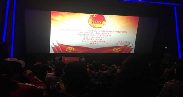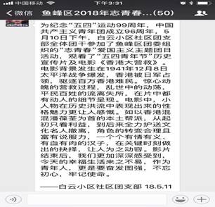 团日活动由三个部分组成,首先是播放纪录片“五四运动-少年中国”,回顾90年前的“五四风雷”。随后,共青团鱼峰区第八届委员会委员、德润社区居委会副主任、德润社区团支部书记江廷都同志带领全体青年面向团旗高举右手,紧握右拳,郑重地重温入团宣言。活动让在场的全体青年回忆起入团时那令人激动而又难忘的时刻,整个会场响彻掷地有声的誓言。之后活动还组织观看爱国主义电影《香港大营救》,该片讲述了1941年12月8日太平洋战争爆发,香港被日军占领,同时为实现对中华民族的文化控制,驻港日军特务机关全城搜捕滞留香港的中方爱国志士和文化名人。茅盾、邹涛、蔡楚生等人为求自保,纷纷隐藏行迹,形势千钧一发,万分危急。此时东江游击队队长叶伟强临危受命进入香港,与日军斗智斗勇,历经重重险阻,最终成功完成解救文化名人任务的故事。