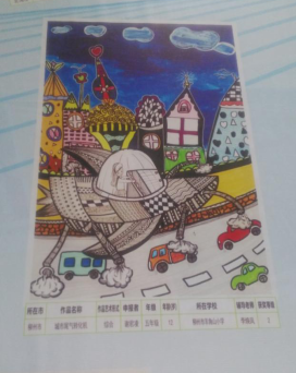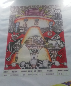 右图为羊角山小学谢君凌同学的《城市尾气转化机》在少年儿童科学幻想绘画竞赛项目中,荣获二等奖