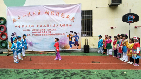 为大力传承和发展中华优秀传统文化,保护我们广西壮族自治区的非物质文化遗产,让辖区幼儿更好的了解“三月三”文化,引导他们认知传统,尊重传统,继承传统、弘扬传统,4月3日上午,五里亭街道龙泉山社区关心下一代工作小组在鸿泰名庭幼儿园开展“展示八桂风采 相约精彩龙泉”传承壮乡文化,走进五彩三月三趣味活动。