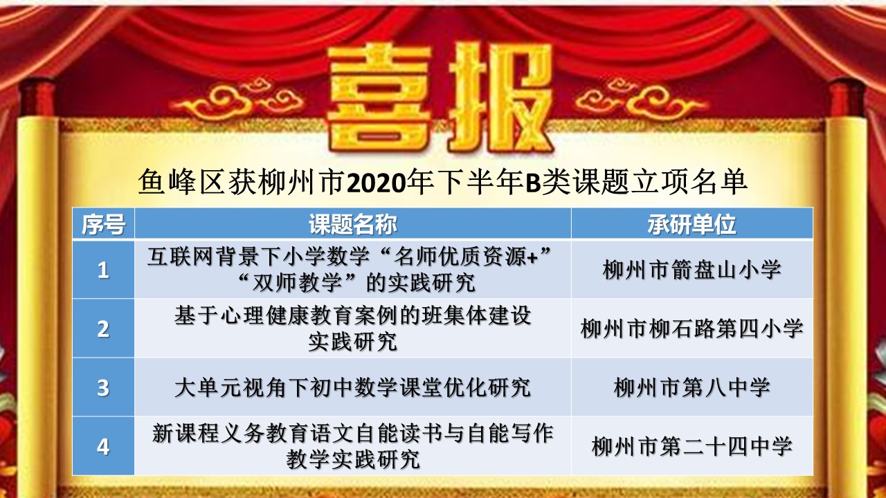 柳州市教育科学规划领导小组办公室本着公平公正、择优立项的原则进行评审,共评出全市九义段A类重点课题4项,我区获得其中的2项,占全市九义段A类立项课题的50%。